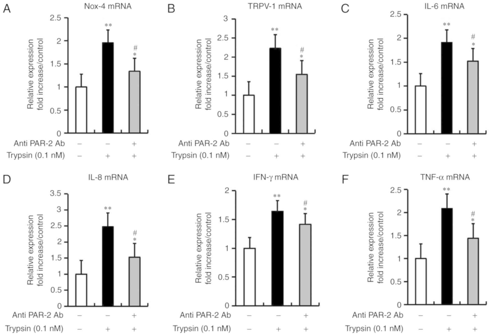 As shown in Fig. 6A-F, the mRNA expression levels of Nox-4, TRPV-1, IL-6, IL-8, IFN-γ and TNF-α were significantly increased when the cells were stimulated with trypsin, serving as a natural PAR-2 agonist, for 4 h. Notably, pretreatment with a blocking antibody against PAR-2 resulted in significant inhibition of the mRNA expression of these inflammatory cytokines in HEECs stimulated with trypsin.