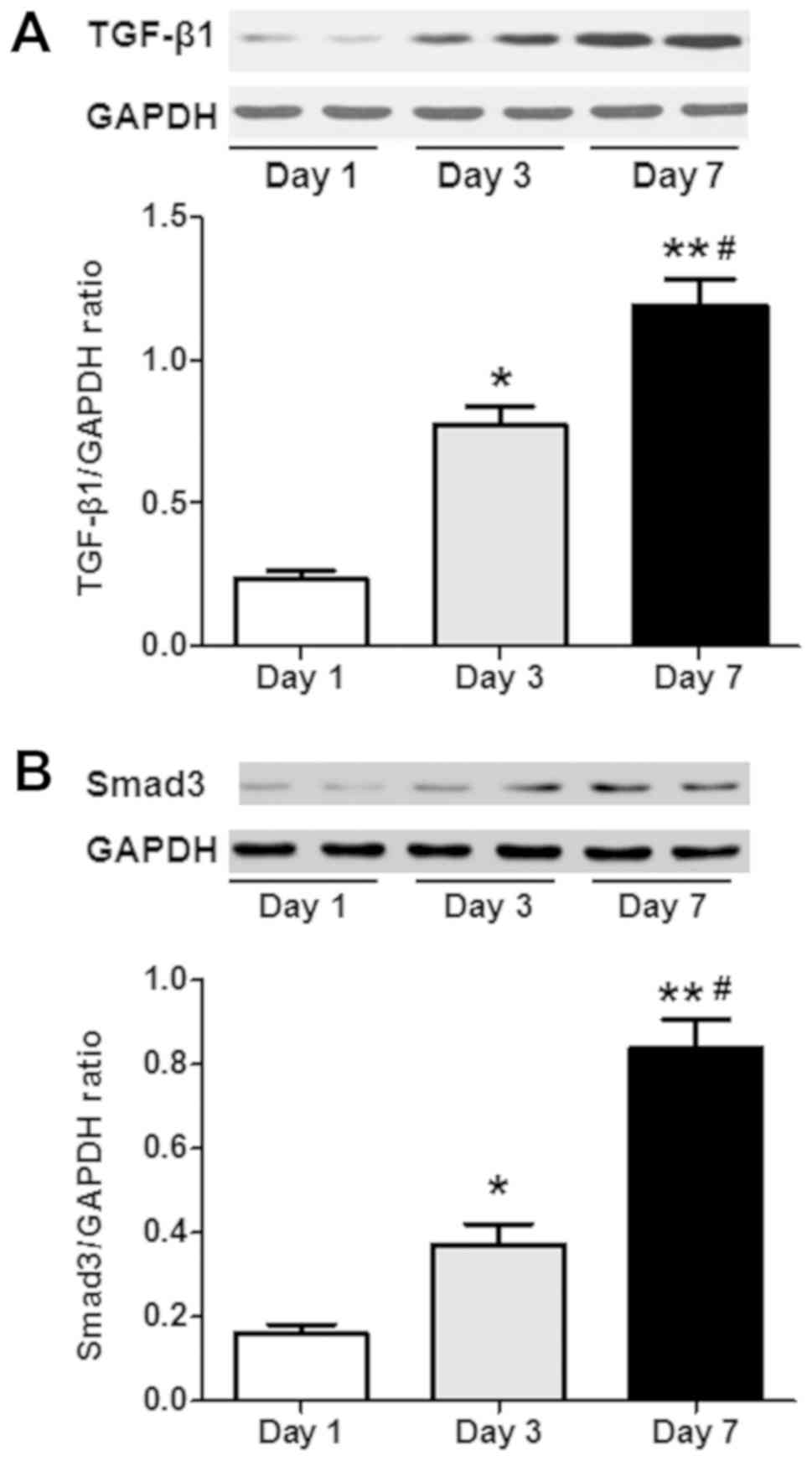 The results of the western blot analysis indicated that HSCs isolated and cultured on day 1 exhibited upregulation of the TGF-β1 and Smad3 proteins on days 3 and 7 (P<0.05; n=6; Fig. 3). The relative expression levels of the TGF-β1 and Smad3 proteins on day 7 were further upregulated compared with those observed on day 3 (P<0.05; n=6; Fig. 3). In the present study, the TGF-β1/Smad3 signaling pathway was also activated during the HSC culture.
