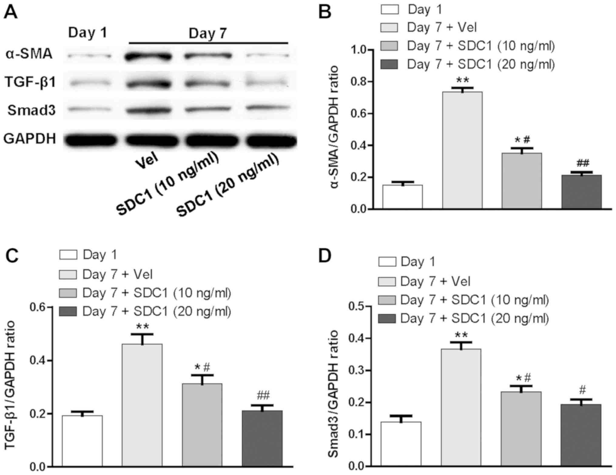 Having demonstrated that the protein expression levels of α-SMA, TGF-β1 and Smad3 in HSCs cultured for 7 days were significantly increased, recombinant SDC1 protein (10 and 20 ng/ml) was added to stimulate HSCs for 24 h on day 6. The expression levels of α-SMA, TGF-β1 and Smad3 were significantly downregulated compared with those of the control group (P<0.05; n=6; Fig. 4). Thus, it was deduced that SDC1 negatively affects the activation of HSCs via the TGF-β1/Smad signaling pathway.