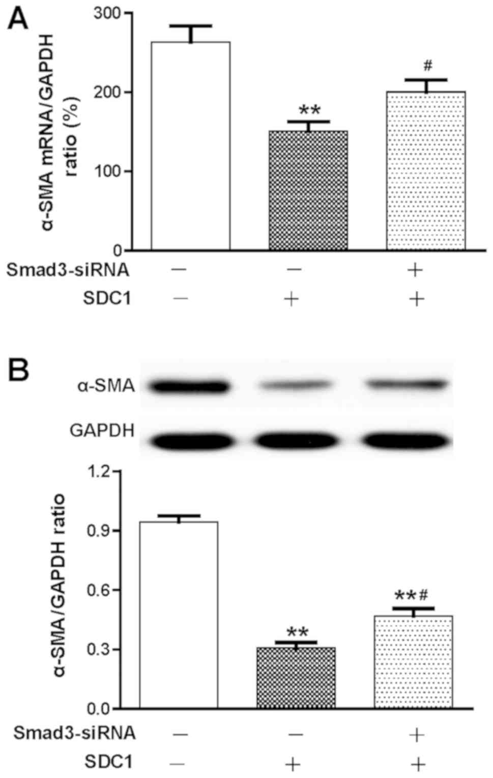 As shown in Fig. 6, the expression levels of α-SMA in HSCs cultured for 7 days were measured by RT-qPCR and western blot assays. SDC1 stimulation significantly decreased the expression levels of α-SMA in HSCs compared with those of the control groups (P<0.01; n=6; Fig. 6). Pretreatment with Smad3-siRNA reduced the effects of SDC1, which increased the expression levels of α-SMA (P<0.01; n=6; Fig. 6). These data suggested that SDC1 markedly inhibits HSC activation, which is likely mediated by activation of the TGF-β1/Smad3 signaling pathway.