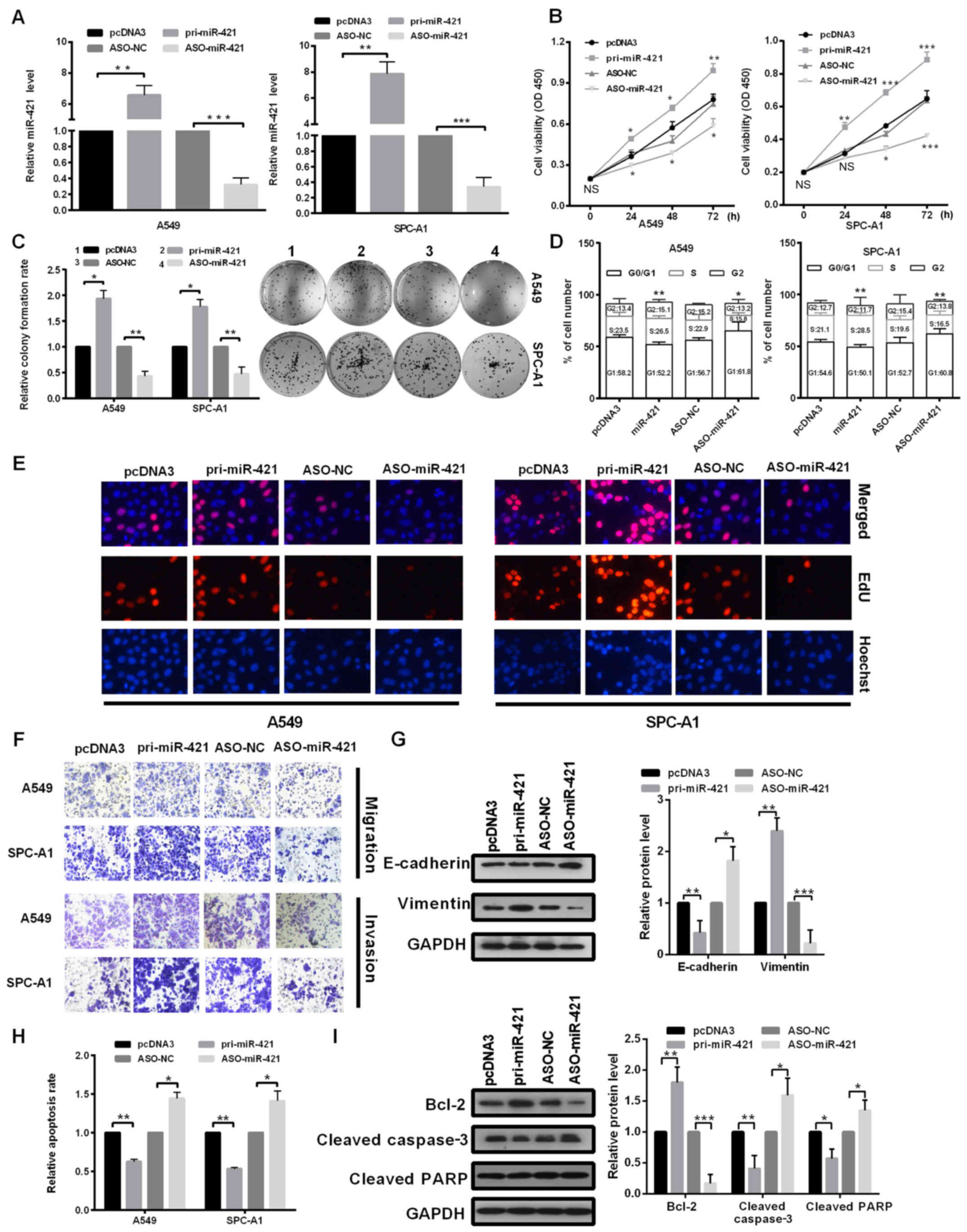 A549 cells or SPC-A1 cells (4×105) were plated in 6-well plates overnight to ensure that cell confluence could reach 60–80% at the time of transfection. Following 6 h transfection at 37°C, the medium was replaced with MEM-a media containing 10% FBS. Lipofectamine 2000 (Invitrogen; Thermo Fisher Scientific Inc.) was employed in cell transfection according to the manufacturer's protocol. They were transiently transfected with 3ug pri-miR-421 or pcDNA3 and 20 µmol ASO-miR-421 or ASO-NC in a well of 6-well plate. Cells were collected for reverse transcription-quantitative PCR (RT-qPCR), proliferation, migration, invasion, apoptosis and cell cycle assay analyses at 24 h. At 48 h post-transfection, cells were collected for western blot analysis and the EGFP fluorescent reporter assay.