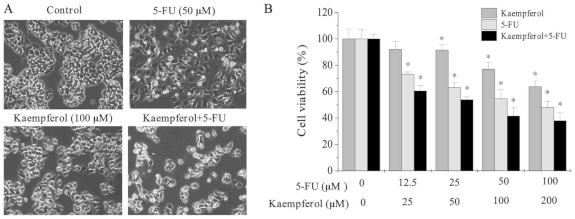 Microscopy was used to observe the cell morphology. Cells treated with 5-FU and kaempferol were crenulated, and the nuclei were dim (Fig. 2A). Cell viability was significantly lower in cells subjected to treatment with 5-FU and kaempferol alone when compared with that of the untreated control cells (Fig. 2B). These results indicated that combined treatment with kaempferol and 5-FU could inhibit the growth of HCT-8 cells.