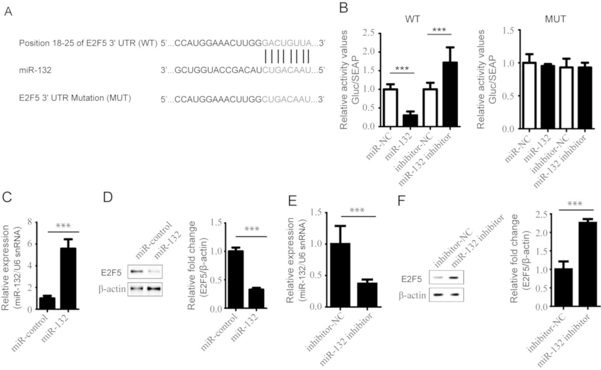 miR-132 mimic, miR-132 inhibitor and corresponding negative control (miR-NC and inhibitor-NC, respectively) were obtained from Shanghai GenePharma Co., Ltd. (Shanghai, China). The wild-type E2F5 3′UTR and mutant-type E2F5 3′UTR were cloned into the reporter plasmid pGL3 (Promega Corporation, Madison, WI, USA) downstream of the luciferase reporter gene according to as previously described (26). For the dual luciferase assay, 293 cells were seeded into a 24-well plate at a density of 2×104 cells per well. Cells were co-transfected with 1 µg of wild-type or mutant luciferase vector and miR-132mimics (100 nM), miR-132 inhibitor (100 nM) or their NCs. After co-transfection for 48 h, luciferase activity was detected using the dual luciferase Reporter Assay System (Promega Corporation) according to the manufacturer's instructions. Firefly luciferase activity was normalized to Renilla luciferase activity.