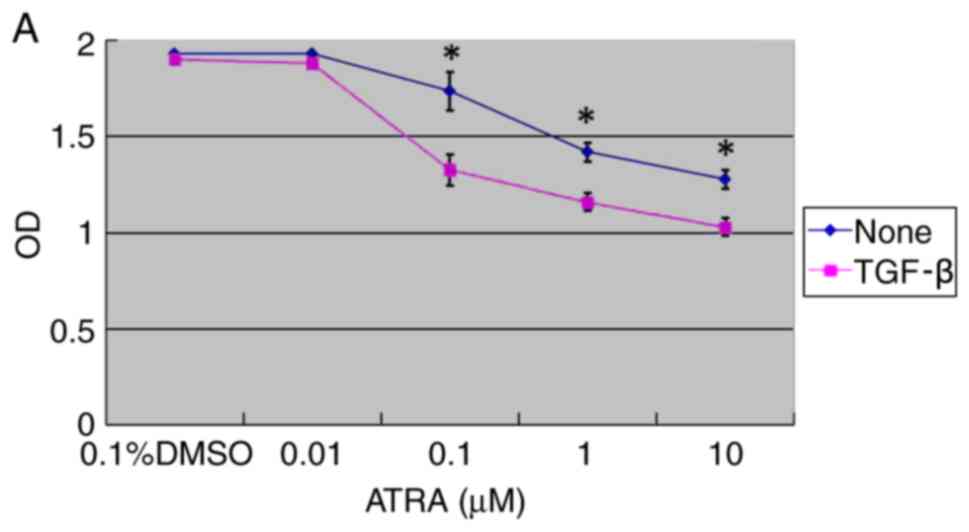 ATRA and TGF-β (Sigma-Aldrich; Merck KGaA) were prepared as 0.4 and 50 ng/ml stock solutions in DMSO, respectively, and were stored below −20°C in the dark. ATRA and TGF-β were diluted to 10–200 µM and 1 ng/ml, respectively, in DMEM (Sigma-Aldrich; Merck KGaA) containing 10% FBS (Gibco; Thermo Fisher Scientific, Inc.) on the day of the experiment. The highest concentration of DMSO in the test solutions was 0.1%. To exclude the possibility that proliferation may be inhibited by DMSO, all cells were exposed to a final DMSO concentration of 0.1% in DMEM containing 10% FBS.