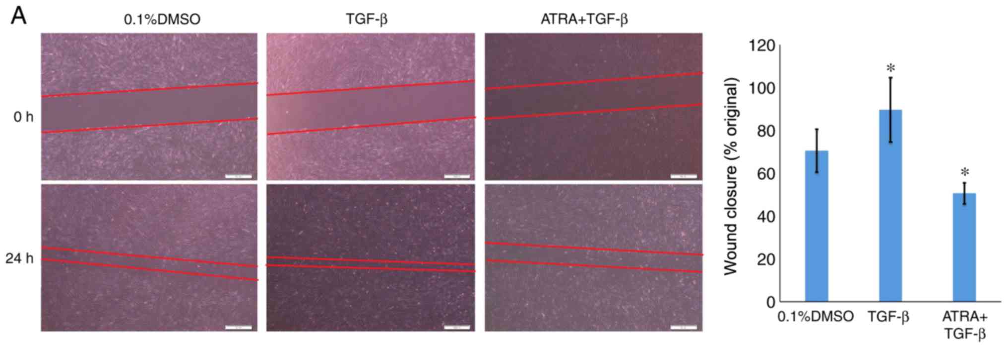 HConFs were seeded at a density of 5×105 cells/well in 6-well plates. The culture medium for the HConFs was replaced after 24 h with serum-free medium, and then cells were incubated for a further 2 h at 37°C. Next, a sterile 20-µl pipette tip was used to scratch a line in the confluent cell monolayer, after which the cells were washed three times with PBS. The scratch wound healed after 24 h of incubation in the following conditions: 1 µM ATRA + 1 ng/ml TGF-β, 1 ng/ml TGF-β and fibroblast medium without ATRA and TGF-β. The effects on HConF migration were evaluated by measuring the area of the wound from the images captured at a magnification of ×100 at 0 and 24 h using a light microscope (Olympus Corporation); analysis was performed using ImageJ version 1.5 (National Institutes of Health).