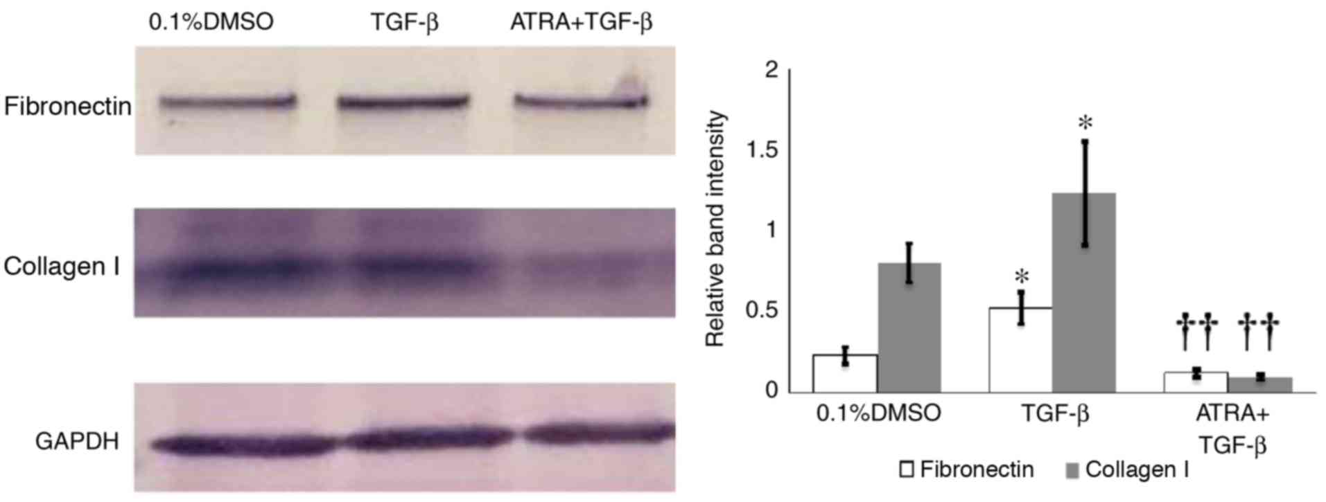 The effect of ATRA on TGF-β-induced ECM production was investigated. Western blotting analysis and densitometric analysis revealed that exposure of HConFs to 1 ng/ml TGF-β for 48 h induced the production of collagen I and fibronectin, whereas 1 µM ATRA inhibited TGF-β-induced synthesis of collagen I and fibronectin by HConFs (P<0.01; Fig. 4).
