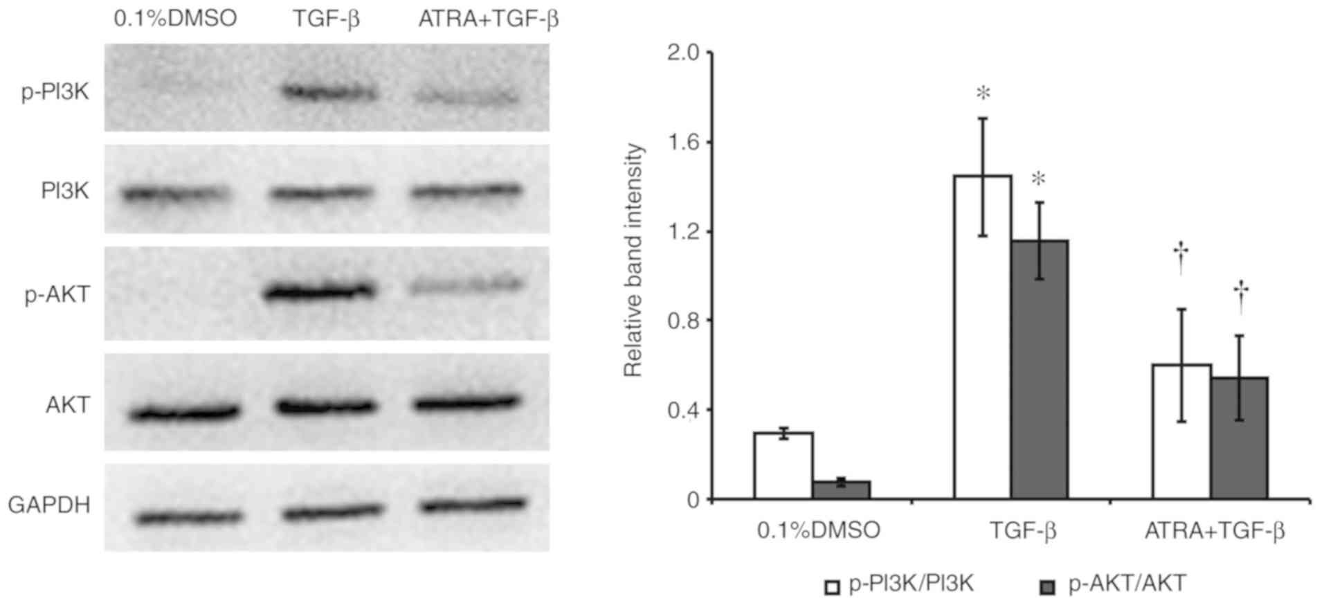 The effect of ATRA on TGF-β-induced PI3K and AKT phosphorylation in HConFs was examined (Fig. 5). Western blotting analysis and densitometric analysis revealed that the exposure of HConFs to 1 ng/ml TGF-β for 48 h induced the phosphorylation/activation of PI3K and AKT. Treatment with 1 µM ATRA inhibited TGF-β-induced PI3K and AKT phosphorylation, indicating that ATRA inhibited the TGF-β-induced PI3K/AKT signaling pathway (P<0.05; Fig. 5).