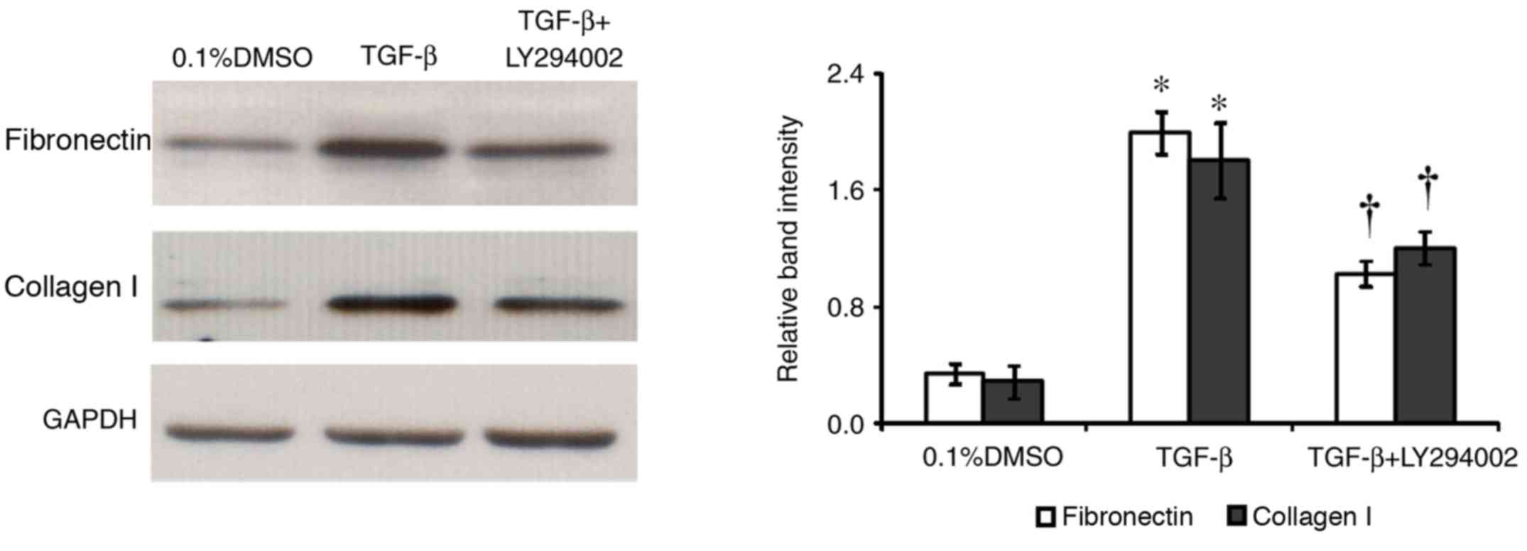 The effect of the PI3K inhibitor LY294002 on the TGF-β-induced expression of collagen I and fibronectin in HConF was investigated. Cells were incubated with 10 µM LY294002 for 1 h before treatment with 1 ng/ml TGF-β for 48 h. Western blotting analysis and densitometric analysis revealed that LY294002 significantly inhibited TGF-β-induced expression of collagen I and fibronectin in HConFs (P<0.05; Fig. 6). The TGF-β-induced expression of collagen I and fibronectin in HConFs was inhibited by 27 and 47% in the presence of LY294002, respectively. The inhibitor had no effect on collagen I and fibronectin expression in the absence of TGF-β (data not shown).