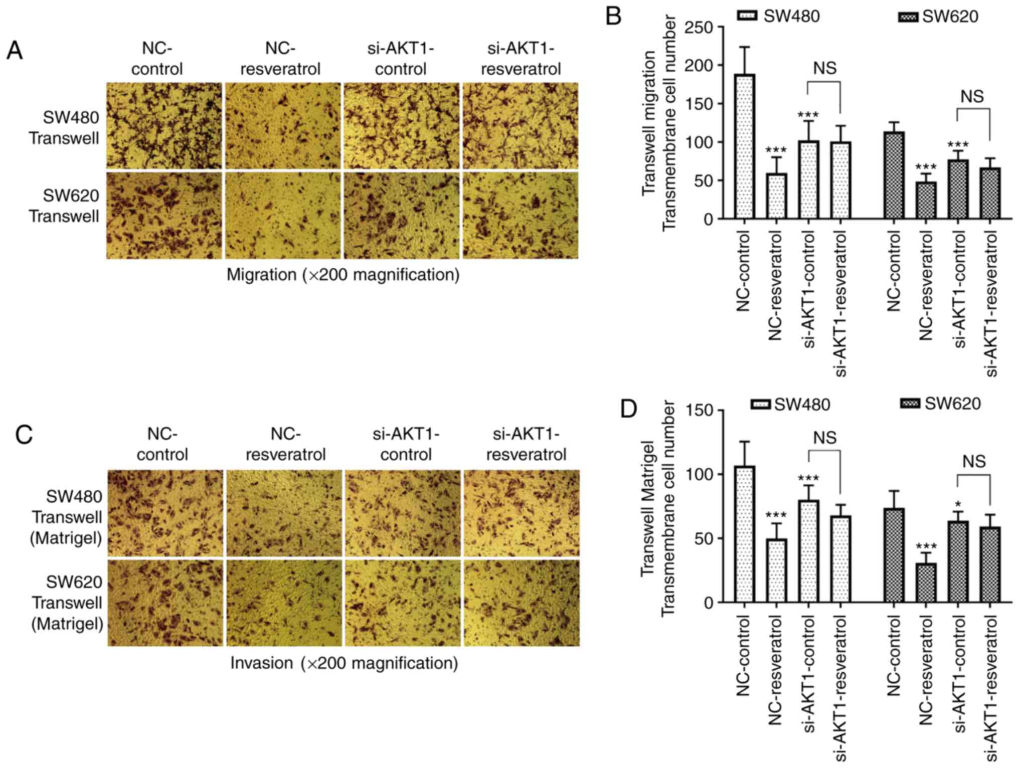 Transwell assays were also performed to detect the migration and invasion of both cell lines (Fig. 4). The number of migrated and invaded cells passing through the membrane in the NC-resveratrol group was significantly lower than that in the NC-control group (P<0.001), indicating that resveratrol markedly inhibited the migration and invasion of colon cancer cells. In addition, the number of migrated and invaded cells passing through the membrane in the si-AKT1-control group was also significantly lower than that in the NC-control group (P<0.05 and P<0.001), indicating that AKT1 knockdown also inhibited the migration and invasion of colon cancer cells. However, there was no significant difference between the number of migrated and invaded cells passing through the membrane in the si-AKT1-control and si-AKT1-resveratrol groups (P>0.05), indicating that the inhibitory effects of resveratrol on the migration and invasion of colon cancer cells were mitigated by AKT1 knockdown.