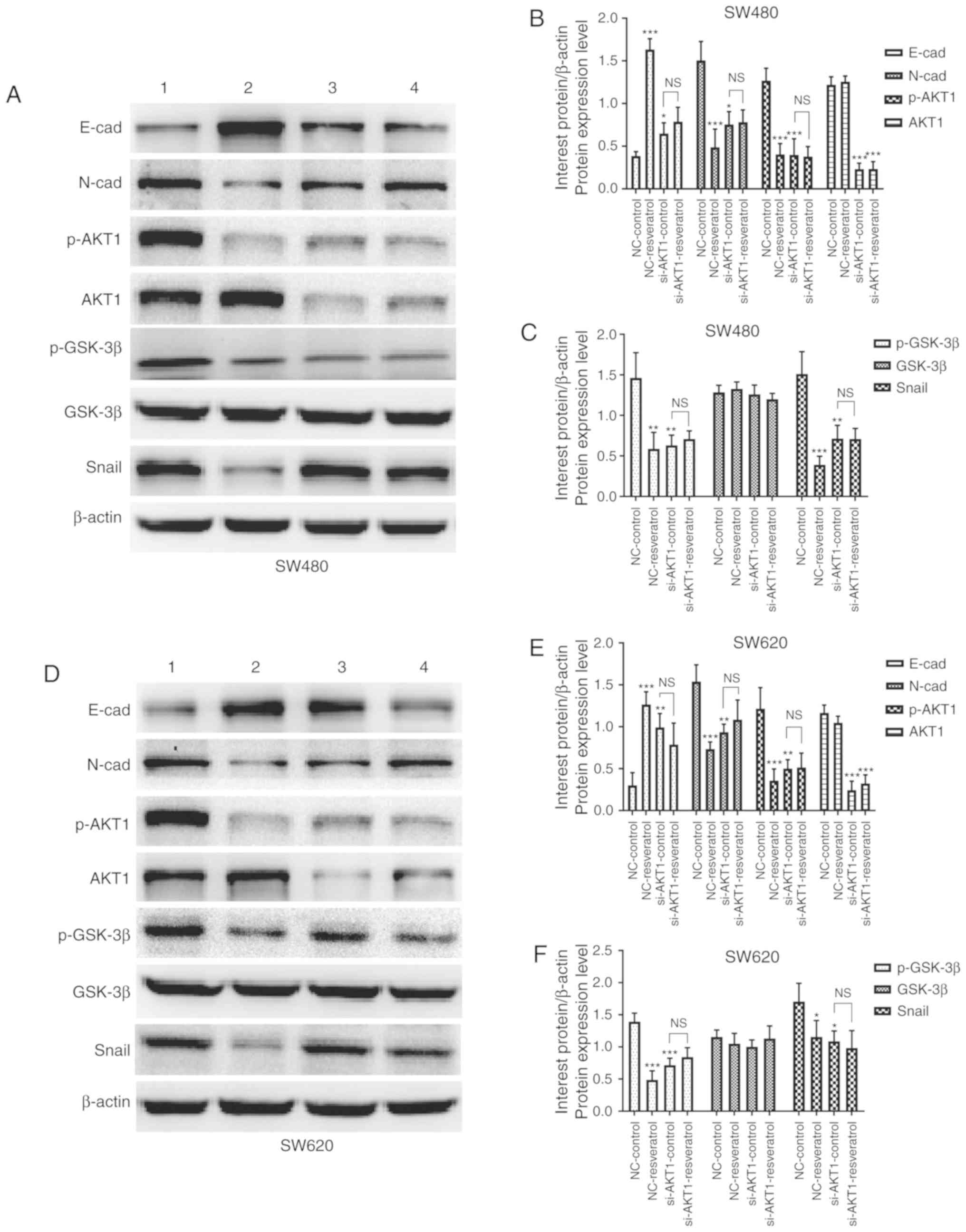 For further investigation of the effects of resveratrol on EMT in colon cancer cells as well as its downstream mechanisms, the expression of EMT markers and AKT/GSK-3β/Snail signaling pathway-related molecules were evaluated in SW480 and SW620 cells after treatment. As revealed by western blotting in Fig. 5A and D, the expression of E-cadherin in both cell lines was markedly upregulated in the NC-resveratrol and si-AKT1-control groups compared to the NC-control group, whereas N-cadherin, p-AKT1, p-GSK-3β, and Snail expression was markedly downregulated. Densitometric analysis revealed consistent changes in the protein expression of the aforementioned genes after resveratrol treatment or AKT1 knockdown (P<0.05, P<0.01 and P<0.001, Fig. 5B, C, E and F). However, protein expression in SW480 and SW620 cells was not significantly different in the si-AKT1-resveratrol and si-AKT1-control groups, indicating that the effects of resveratrol on the reversal of EMT in colon cancer cells was markedly weakened or even nullified by AKT1 knockdown (P>0.05). These data indicated that resveratrol reversed EMT in colon cancer cells by regulating the AKT/GSK-3β/Snail signaling pathway.