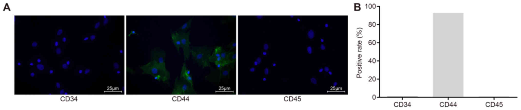 Cells at passage 5 were inoculated in a 24-well plate with a prepared sterile coverslip at a density of 4×104/ml and cultured at 37°C under 5% CO2. The cells were fixed with 4% paraformaldehyde at room temperature for 30 min, treated with 0.3% TritonX-100 at room temperature for 30 min, and blocked with goat serum (Thermo Fisher Scientific Inc.) for 1 h at room temperature. Next, the cells were incubated at room temperature for 3 h with the following primary antibodies: Rat anti-human CD34 (bsm-16538M, 1:100; BIOSS), CD44 (bsm-51065M, 1:100; BIOSS) and CD45 (bs-4819R, 1:100; BIOSS). After three washes with PBS with Tween-20 (PBST), the cells were incubated with FITC-labeled secondary goat anti-mouse antibody (bs-0293P, 1:100, BIOSS) at room temperature for 1 h, avoiding exposure to light. Finally, the cells were rinsed three times with PBST, mounted with neutral resin, and observed and photographed under a confocal laser scanning microscope (LSM 700; Carl Zeiss AG); the number of positive cells were counted in a random field per view.