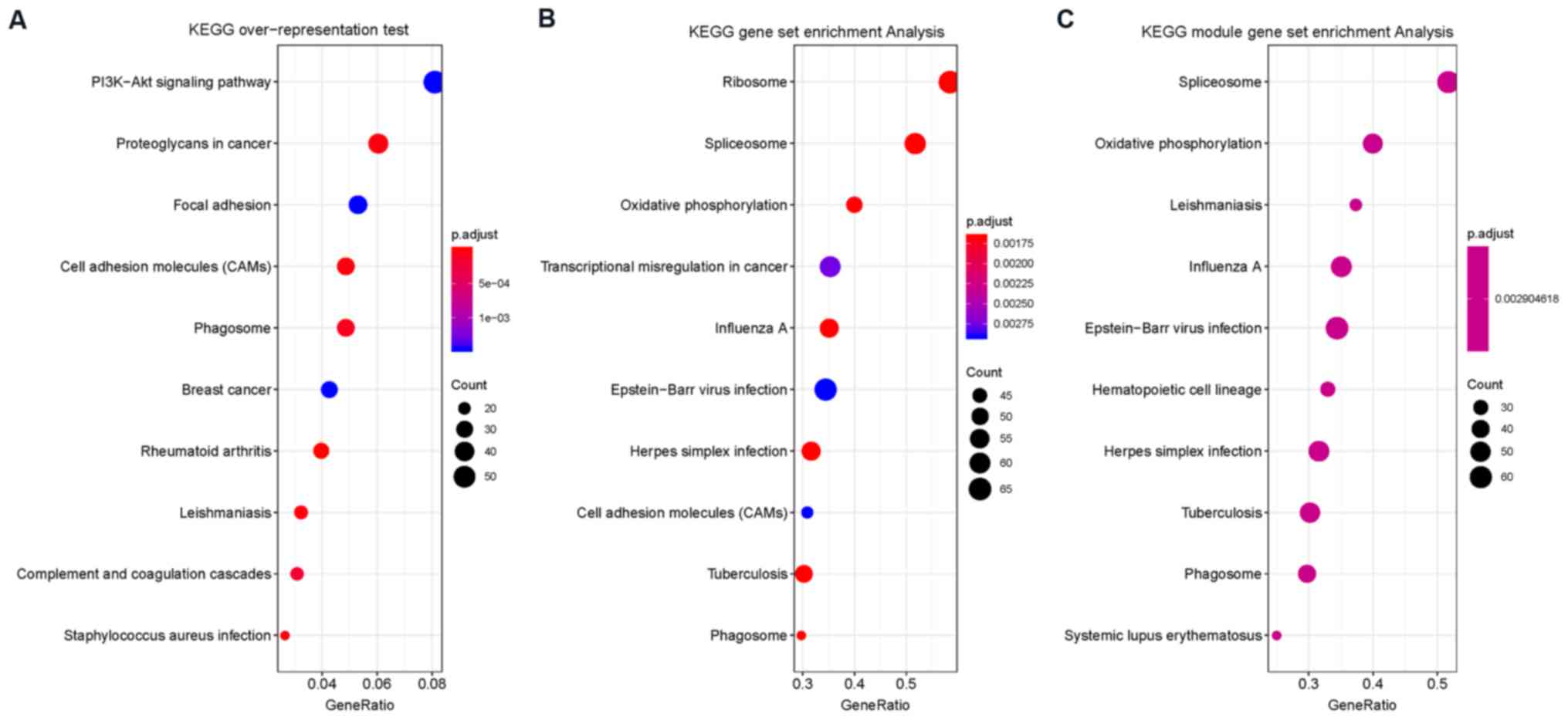KEGG overrepresentation analysis demonstrated that DEGs were enriched in ‘PI3K-Akt signaling pathway’, ‘proteoglycans in cancer’, ‘focal adhesion’, ‘cell adhesion molecules (CAMs)’, ‘phagosome’, ‘breast cancer’, ‘rheumatoid arthritis’, ‘leishmaniasis’, ‘complement and coagulation cascades’ and ‘staphylococcus aureus infection’. KEGG enrichment analysis showed that DEGs were enriched in ‘ribosome’, ‘spliceosome’, ‘oxidative phosphorylation’, ‘transcriptional dysregulation in cancer’, ‘influenza A’, ‘Epstein-Barr virus infection’, ‘herpes simplex infection’, ‘cell adhesion molecules (CAMs)’, ‘tuberculosis’ and ‘phagosome’.