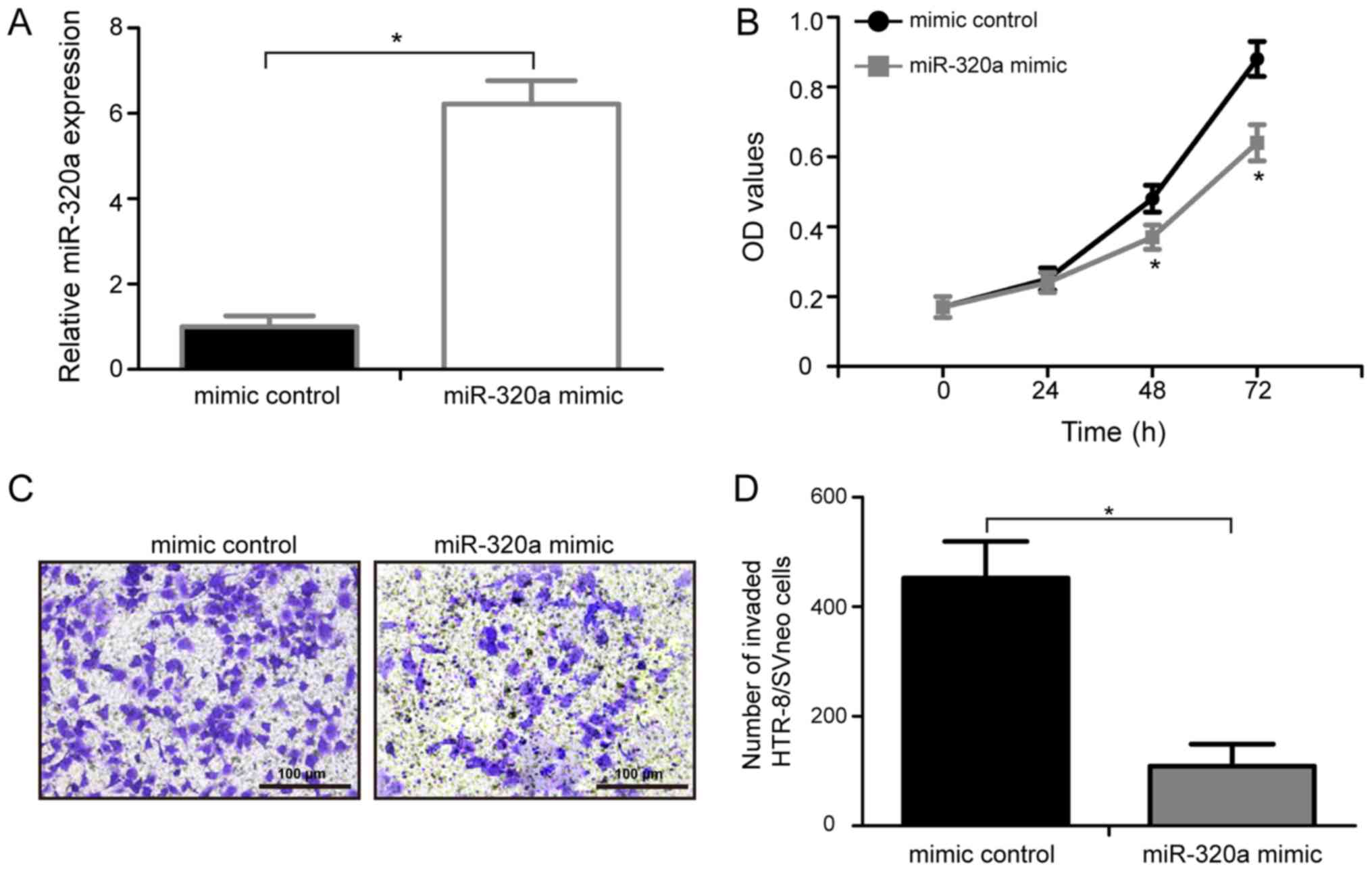 To identify the biological roles of miR-320a in PE, miR-320a mimic or mimic control were transfected into HTR-8/SVneo cells, and a MTT assay was performed to examine the effects of miR-320a on the proliferation of HTR-8/SVneo cells in vitro. RT-qPCR analysis showed that miR-320a expression levels in HTR-8/SVneo treated with miR-320a mimic were significantly upregulated compared with cells transfected with control mimic (Fig. 2A; P<0.05). Compared with cells transfected with control mimic, cells transfected with miR-320a exhibited a significantly decrease in cell proliferation at 48 and 72 h (Fig. 2B; P<0.05). The present data suggested that the upregulation of miR-320a is involved in the development of PE by inhibiting the proliferation of HTR-8/SVneo cells.