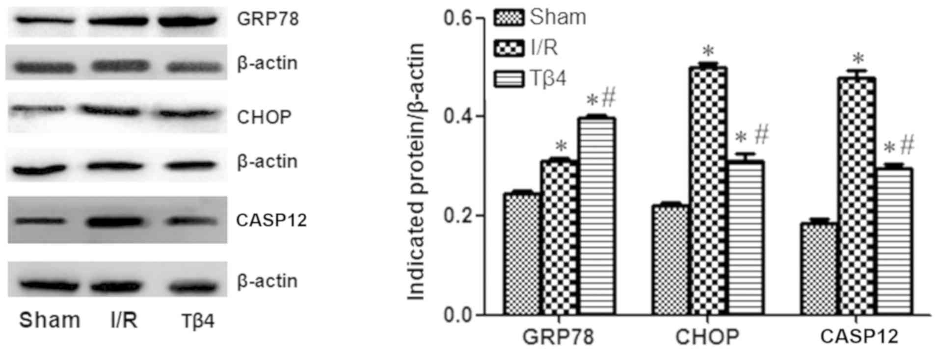 The present study had some limitations. Firstly, although the expression of GRP78, CHOP, and CASP12 was detected in the present study, and GRP78 and CHOP are typical markers of ERS, the potential function of GRP78 and CHOP in the protection induced by Tβ4 needs to be assessed. Secondly, other UPR pathways were not investigated in the present study.