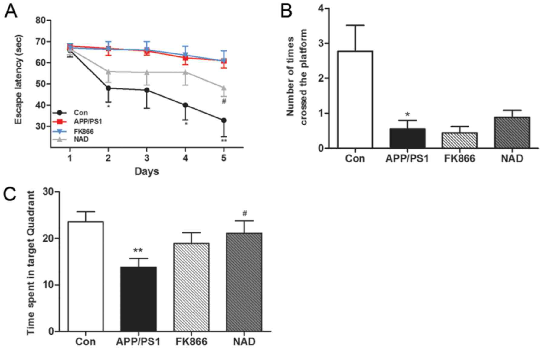 Memory impairment in APP/PS1 transgenic mice was determined using the MWM test in terms of the escape latency. The results demonstrated that, with the increase in the number of training days, the escape latency gradually shortened. On the fifth day, the escape latency of the APP/PS1 group (AD) mice was significantly longer compared with the blank control group (P<0.01), suggesting that the learning and memory abilities of AD mice were significantly impaired. Furthermore, the escape latency of NAD+ mice was significantly shorter than that of APP/PS1 mice after intraperitoneal injection of NAD+ (P<0.01); while, after FK866 intervention, there was no significant change in escape latency in the FK866 mice compared with the APP/PS1 mice (Fig. 1A).