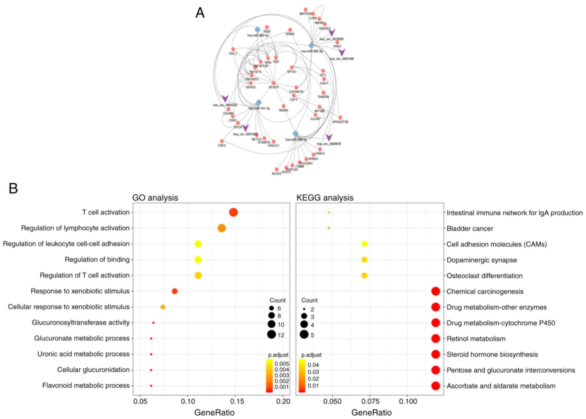 As presented in Fig. 2A, a hub circRNA-miRNA-upregulated mRNA network was built. The results of enrichment analysis of the 85 upregulated genes are presented in Fig. 2B and Table II. The upregulated genes were mainly enriched in BP, including ‘flavonoid metabolic process’, ‘cellular glucuronidation’ and ‘T cell activation’. In addition, these DEGs were enriched in MF, including ‘glucuronosyltransferase activity’, ‘UDP-glycosyltransferase activity’ and ‘protein heterodimerization activity’. KEGG pathway analysis suggested that DEGs were associated with ‘ascorbate and aldarate metabolism’, ‘pentose and glucuronate interconversions’, ‘steroid hormone biosynthesis’ and ‘retinol metabolism’.