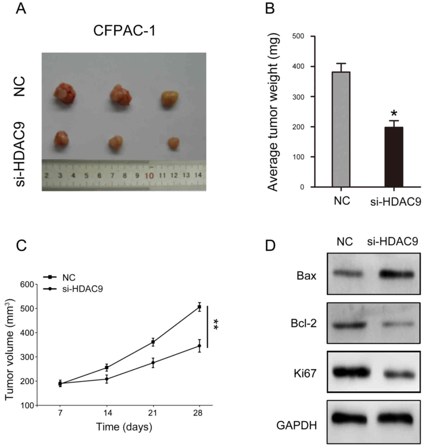 The present study investigated the influence of HDAC9 in vivo. The results indicated that reducing the expression of HDAC9 may significantly inhibit the volume and weight of tumors formed by CFPAC-1 cells (Fig. 6A-C). In addition, key molecules involved in cell proliferation and apoptosis were analyzed. The present results suggested that HDAC9 silencing decreased Bcl-2 and Ki67 expression levels, and increased Bax expression (Fig. 6D).