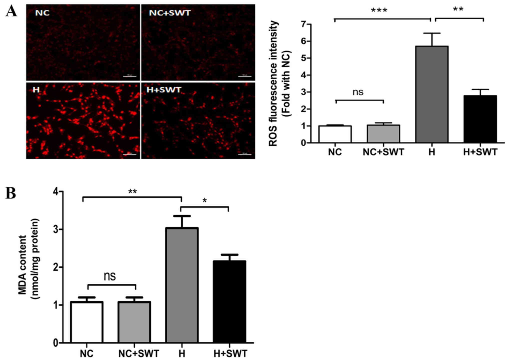 In order to investigate the effect of SWT on hypoxic injury, SWT was applied to HL-1 cells during the first 10 min of reperfusion. SWT led to increased cell viability (Fig. 1A), a significant decrease in apoptosis as manifested by reduced apoptotic cells (Fig. 1B) and an elevated Bcl-2/Bax ratio specifically in hypoxic cells (Fig. 2), which was demonstrated by the morphological changes of HL1 cells and the decreased number of dead cells after SWT (Fig. S1). Accumulating evidence has suggested that excessive ROS generation during ischemia could stimulate apoptosis (23). Therefore, the present study determined whether SWT inhibited ROS production in the hypoxic model. Using DHE staining, the present study revealed increased ROS production following hypoxia treatment, and ROS levels were decreased by SWT (Fig. 3A). Excessive production of ROS results in lipid peroxidation that generates oxidized by-products, such as MDA (24). Thus, the present study detected MDA levels using the TBA method. As presented in Fig. 3B, the hypoxic challenge caused a markedly increased MDA level, which was downregulated by SWT (NC group vs. HR group vs. HR + SWT group, 1.0780±0.1229 nmol/mg protein vs. 3.5000±0.1600 nmol/mg protein vs. 2.8000±0.2300 nmol/mg protein, respectively). Furthermore, in order to determine the molecular mechanisms underlying the protective effects of SWT on hypoxic injury, cell survival-associated proteins, including p38MAPK and Akt, were measured. Western blot analysis revealed that cells exposed to hypoxia exhibited significantly decreased expression of p-Akt and significantly increased expression of p-p38MAPK (Fig. 2). In addition, it was revealed that SWT significantly suppressed hypoxia-induced p38MAPK phosphorylation and increased p-Akt in HL-1 cells. Overall, these data suggested that SWT could reverse oxidative stress and apoptosis in HL-1 cells exposed to hypoxia.