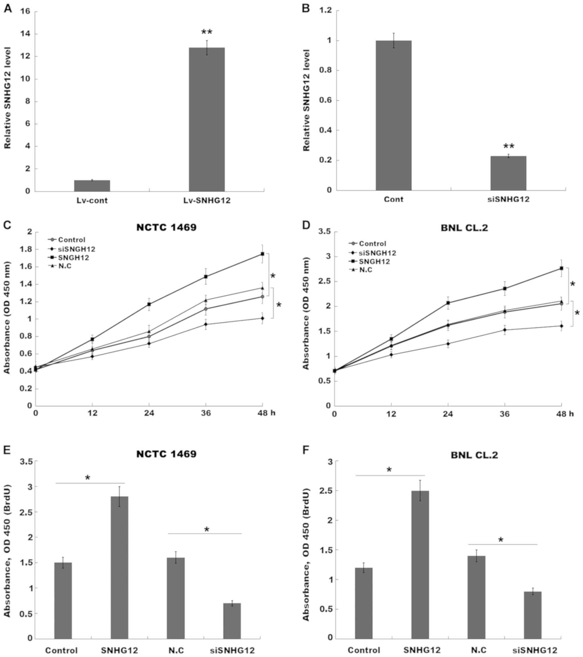 To investigate the role of SNHG12 in hepatocyte proliferation, a CCK-8 assay was performed using normal mouse liver cell lines (NCTC 1469 cells and BNL CL.2 cells) following SNHG12-overexpression or -knockdown. Fig. 2A and B revealed that SNHG12 expression was significantly increased in NCTC 1469 cells after treatment with Lv-SNHG12, and decreased after treatment with SNHG12-specific siRNA (siSNHG12). Furthermore, NCTC 1469 hepatocyte proliferation was significantly increased by the overexpression of SNHG12 (Fig. 2C), which also promoted BNL CL.2 cell proliferation (Fig. 2D), whereas SNHG12-knockdown decreased NCTC 1469 and BNL CL.2 cell proliferation (Fig. 2C and D).