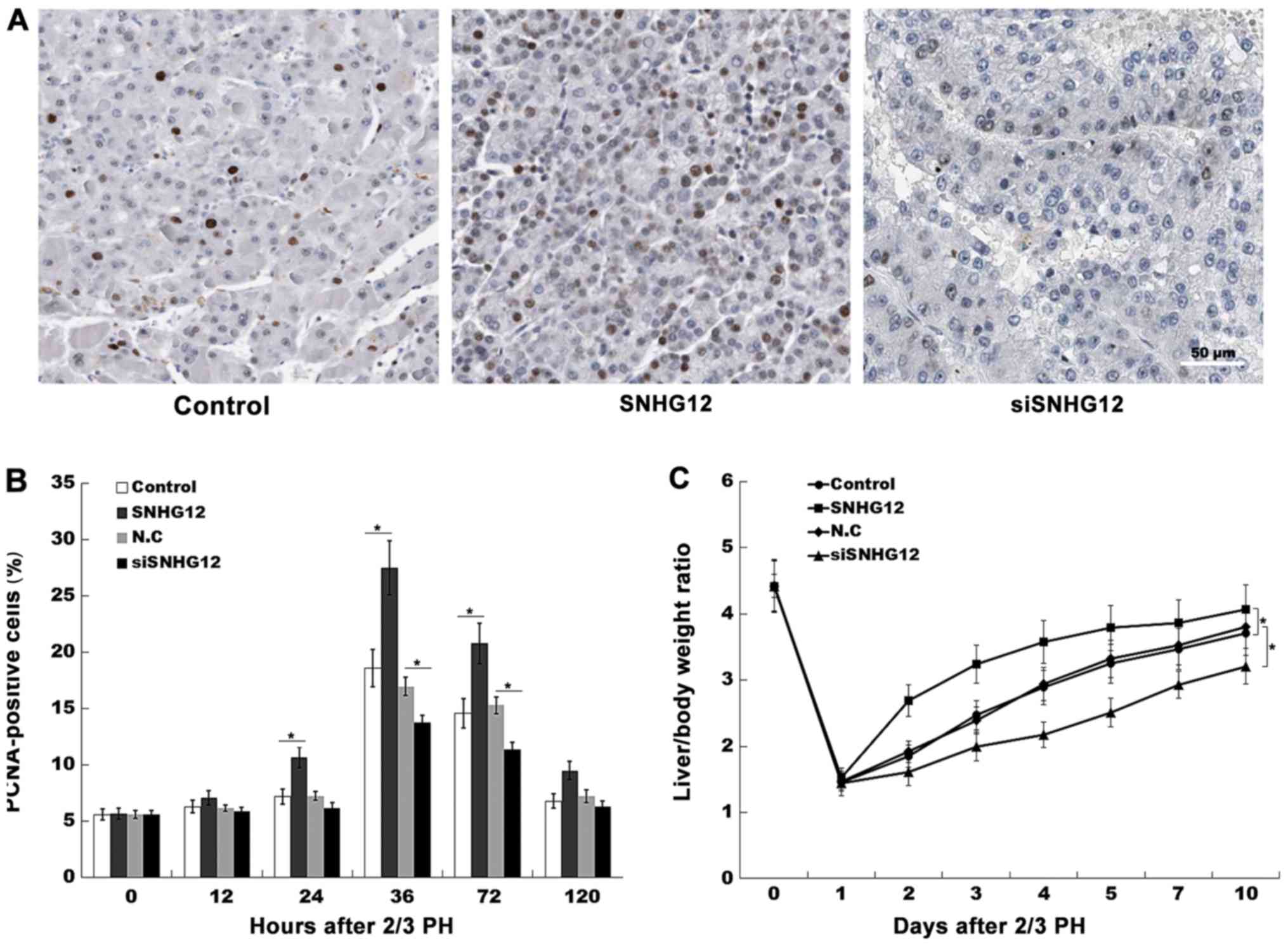 The results of the BrdU ELISA assays also indicated that hepatocyte proliferation was increased after SNHG12-overexpression, and suppressed by SNHG12-knockdown (Fig. 2E and F). Subsequently, to assess hepatocyte proliferation in vivo, the expression level of PCNA was investigated by IHC in mouse-model tissues. At 36 h post-2/3 PH, SNHG12-treated mice exhibited a higher number of PCNA-positive nuclei in the hepatocytes (Fig. 3A and B). Furthermore, the role of SNHG12 in regulating liver regeneration was assayed. As revealed in Fig. 3C, after 2/3 PH the liver/body weight ratio of mice overexpressing SNHG12 was significantly greater than that of the control mice. Conversely, SNHG12-inhibition suppressed hepatocyte proliferation in vivo and reduced the liver/body weight ratio (Fig. 3A-C). These data indicated that SNHG12 upregulation contributed to hepatocyte proliferation in vitro and in vivo.