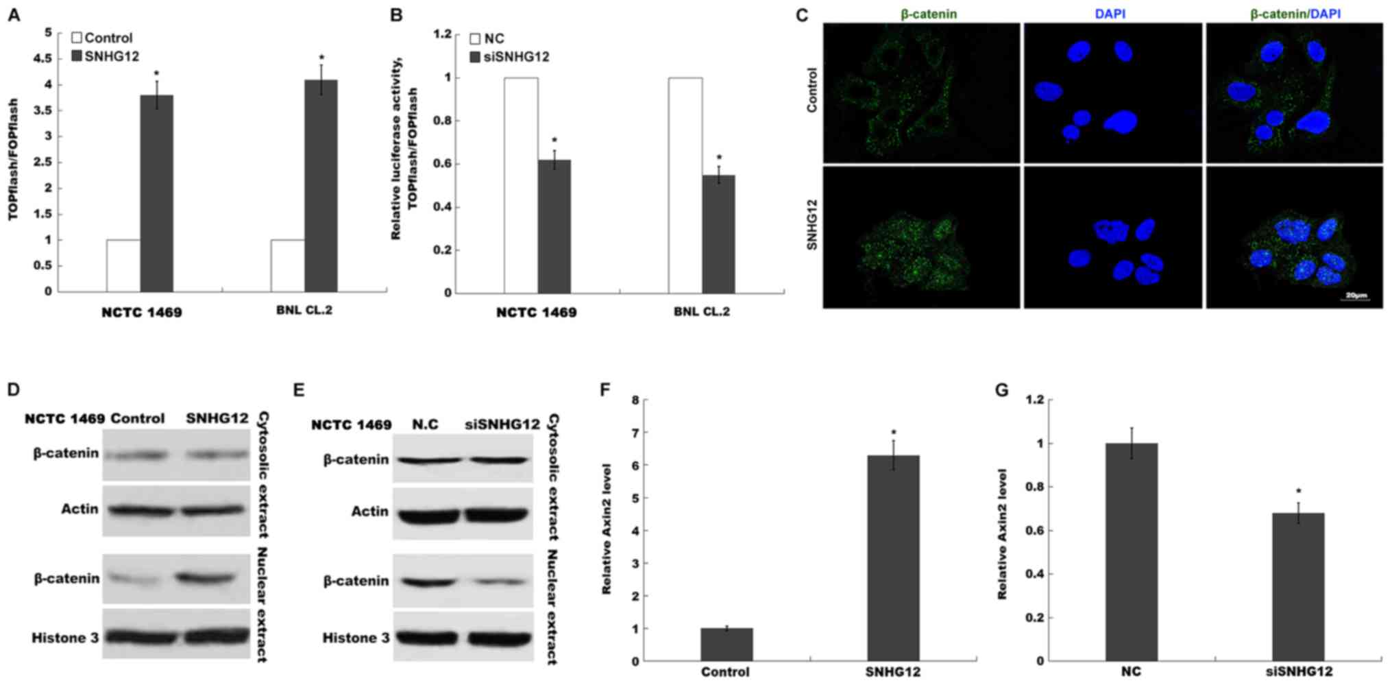 Previous studies have demonstrated the Wnt/β-catenin pathway as the key factor in triggering liver regeneration after PH (25). Furthermore, lncRNAs can control liver regeneration by regulating Wnt/β-catenin signalling (10). lncRNA SNHG12 was revealed to promote cellular proliferation and metastasis by activating the Wnt/β-catenin pathway in papillary thyroid cancer (13). Therefore, the present study sought to investigate whether SNHG12 regulated Wnt/β-catenin in hepatocytes following PH. A TOPflash/FOPflash assay was first carried out to verify the role of SNHG12 in Wnt regulation. Fig. 4A and B indicated that the relative luciferase activity of BNL CL.2 and NCTC 1469 cells was significantly increased following SNHG12 overexpression, whereas SNHG12 knockdown suppressed the luciferase activity, compared with the control. When Wnt signaling is activated, β-catenin is dephosphorylated and translocates into the nucleus, where it promotes the expression of downstream target genes (26,27). In the present study, the effects of the SNHG12-induced nuclear translocation of β-catenin were also investigated. SNHG12-induced nuclear translocation was further investigated using immunofluorescence (Fig. 4C). When SNHG12 was overexpressed in NCTC 1469 cells, β-catenin nuclear translocation was markedly increased (Fig. 4D), whereas SNHG12-knockdown inhibited the nuclear translocation of β-catenin (Fig. 4E). Axin-2, a downstream target of Wnt/β-catenin signaling, was also enhanced in BNL CL.2 cells after SNHG12 overexpression, yet suppressed following SNHG12 knockdown, compared with the control (Fig. 4F and G). These results demonstrated that SNHG12 is a regulator of Wnt/β-catenin signaling.