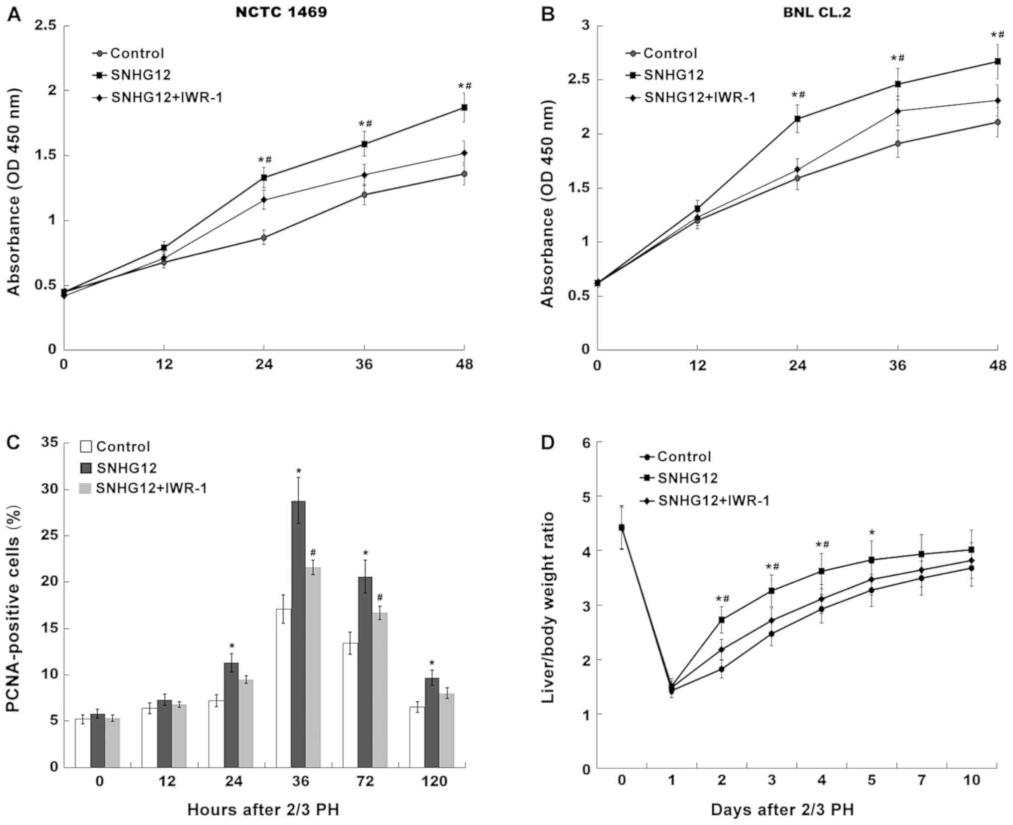 Collectively, the results of the present study demonstrated the potential regulatory role of SNHG12 in liver regeneration. In vitro and in vivo studies revealed that SNHG12 promoted hepatocyte proliferation by activating the Wnt signaling pathway. This indicates that SNHG12 may be used as a biomarker of prognosis for liver diseases and the success of resection.