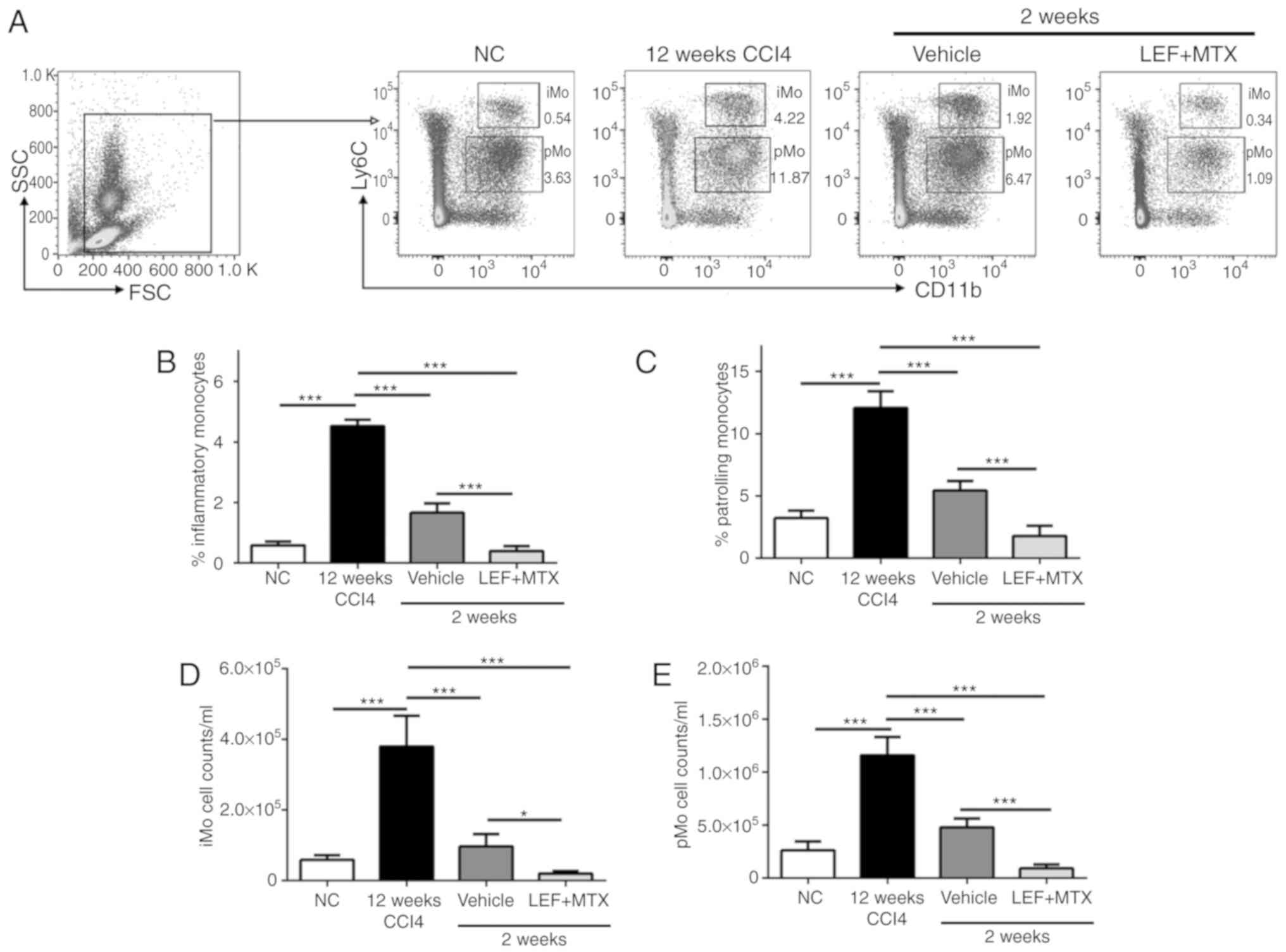 It has been demonstrated that combination LEF+MTX has a potent effect on the inhibition of leucopoiesis (7). The absolute numbers and percentages of monocytes in blood from the mice that experienced recovery at 2 weeks were measured. The gating strategy used to identify the inflammatory monocytes (iMo, CD11b+Ly6Chigh) and the patrolling monocytes (pMo, CD11b+Ly6Cint) is illustrated in Fig. 3A. Treating mice with CCl4 for 12 weeks significantly increased the number of monocytes in the blood. After 2 weeks of recovery, iMo and pMo were decreased in the mice, whether or not they were treated with LEF+MTX (Fig. 3B-E). Compared with the vehicle group, either the absolute numbers or cell percentages of iMo and pMo were decreased in the LEF+MTX-treated mice. In summary, the LEF+MTX combination significantly reduced the levels of two monocyte subsets in the mice that underwent fibrosis recovery, and this may cause the impaired recruitment of monocytes to the site of liver fibrosis, although this requires further investigation.