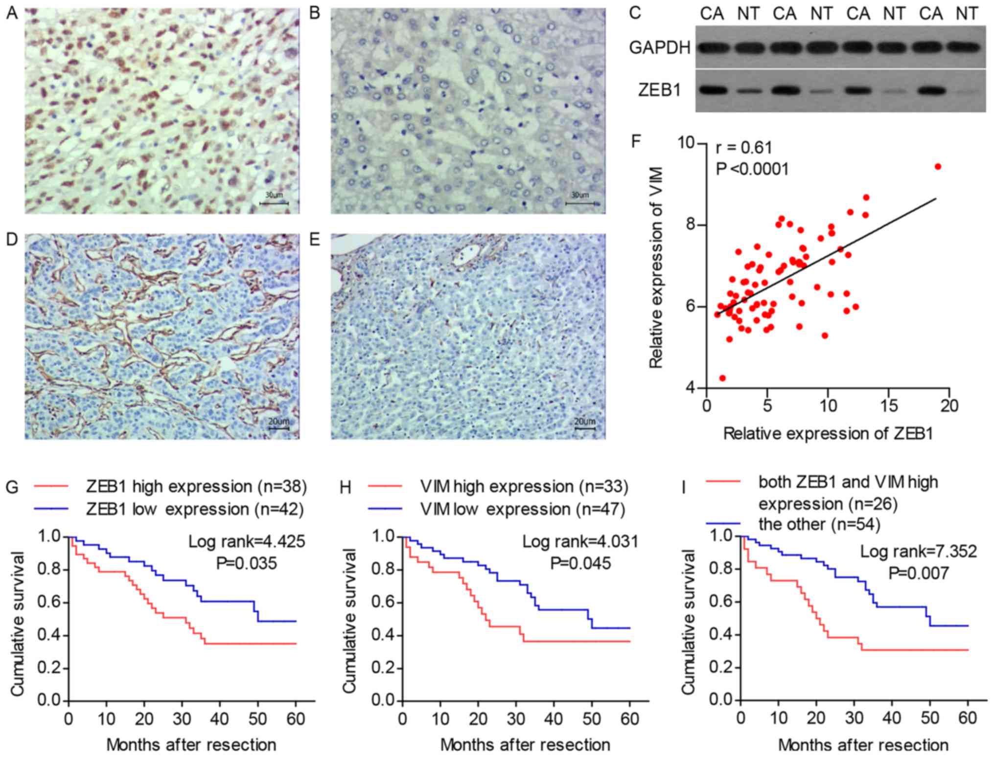 Table I.Clinicopathological variables and the expression of ZEB1 and VIM in hepatocellular carcinoma. |