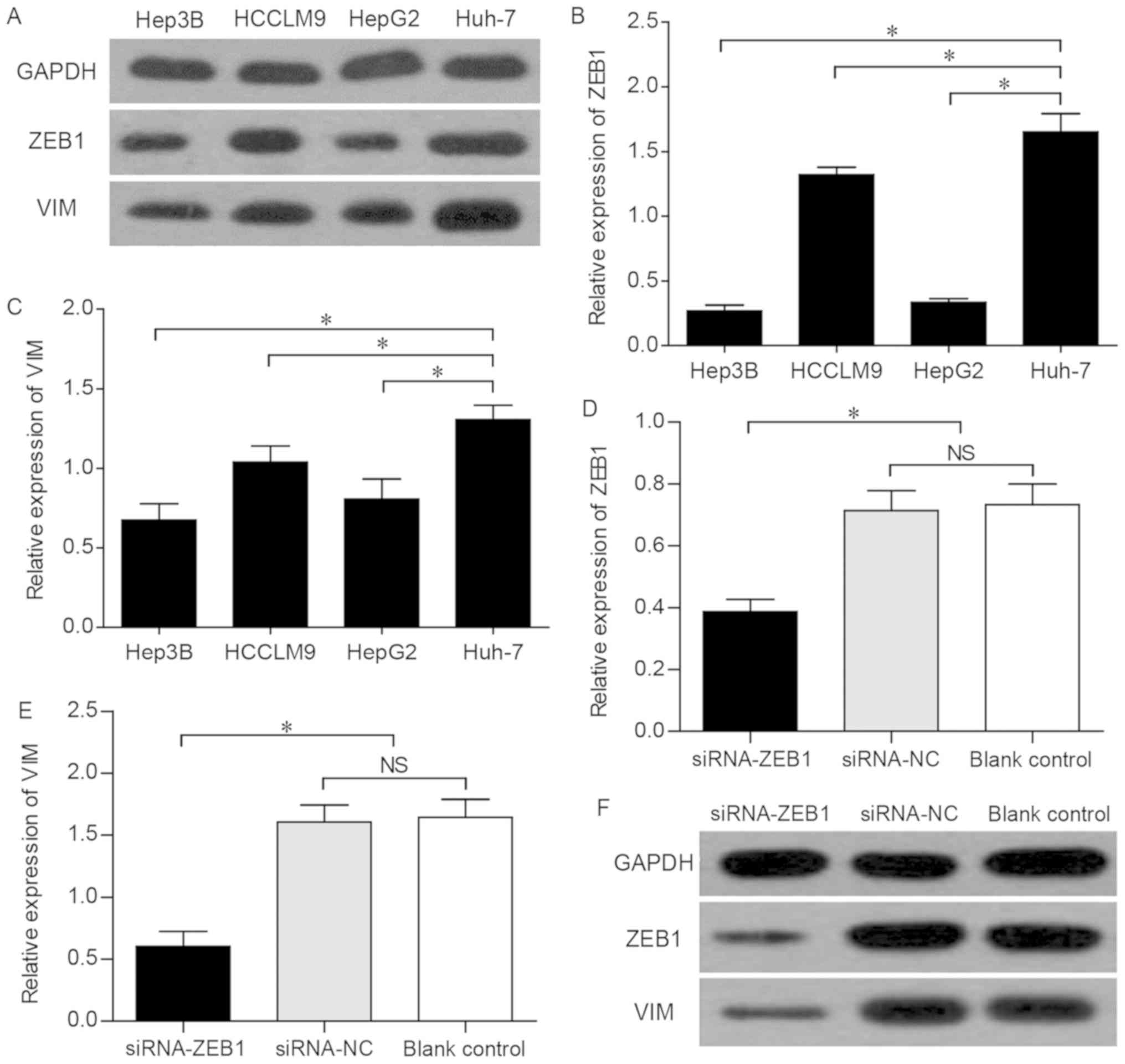 Hepatocellular carcinoma (HCC) is one of the most common malignancies worldwide, ranking fifth among all malignant tumors. According to previous reports, it is estimated that ~500,000–1,000,000 new cases of HCC are diagnosed annually, and HCC ranks third in terms of mortality rate among all types of cancer (1). Invasion, metastasis and postoperative recurrence are the main causes of mortality in patients with HCC, and they are also the key factors affecting clinical treatment and prognosis. Due to its aggressive course and propensity for metastasis and invasion, HCC is often diagnosed at an advanced stage and is associated with a high mortality rate (2). Previous studies have demonstrated that aberrant activation of epithelial-to-mesenchymal transition (EMT) is important in tumor cell invasion and metastasis. EMT allows normal hepatic epithelial cells to undergo multiple biochemical changes that enable them to assume a mesenchymal phenotype, which includes enhanced migratory capacity, invasiveness, increased resistance to apoptosis and a marked increase in the production of extracellular matrix components (3). It has been gradually realized that EMT involves multiple molecular mechanisms and signal transduction pathways, the hallmark of which is the downregulation of cell adhesion molecule epithelial cadherin (E-cadherin) and the upregulation of mesenchymal molecule vimentin (VIM). In addition, a number of transcriptional factors have been identified as crucial inducers of EMT, including the Snail homologues, the basic helix-loop-helix and the zinc-finger E-box-binding homeobox (ZEB) (4). ZEB1, also referred to as TCF8 or dEF1, is a member of the zinc-finger family of proteins. The zinc finger clusters at both sides of ZEB1 can bind to specific sequences of DNA, thereby regulating the transcription of targeted genes (5,6), which has emerged as a key event in cancer progression. Numerous studies have demonstrated that abnormal expression of ZEB1 in endometrial, colorectal and prostate cancer has been associated with disease aggressiveness, low differentiation, development of metastases and poor prognosis (7–9). It has been demonstrated that, by interacting with the E-box element within the proximal region of the E-cadherin promoter, ZEB1 can affect its expression (10), which is crucial in the occurrence and development, and in the metastasis and invasion of most types of cancer (11). However, few studies have examined the correlation between ZEB1 and VIM in HCC, and the specific regulatory mechanism remains to be fully elucidated. The aim of the present study was to investigate the association between the expression of ZEB1 and VIM in HCC tissues and adjacent normal tissues by immunohistochemistry and western blotting. The study also aimed to detect the changes in the biological behavior of Huh7 cells upon downregulation of the expression of ZEB1 by small interfering RNA, in order to evaluate the clinical relevance of the expression status of ZEB1 and VIM and provide data for the prognosis and targeted therapy of HCC.