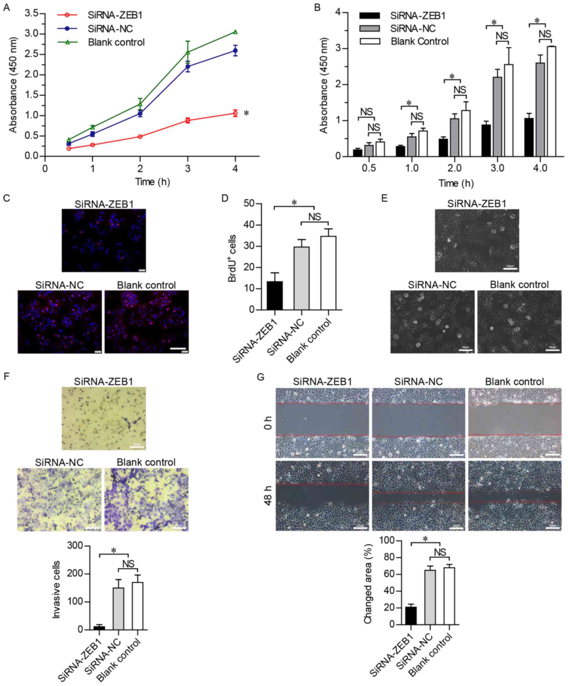 To investigate the effect of the suppression of ZEB1 on cell viability, a CCK-8 assay was used over a period of 4 h, and cell viability was found to be significantly lower in the siRNA-ZEB1-transfected group compared with that in the other two groups (P<0.05; Fig. 3A and B), indicating that cell viability was suppressed by the knockdown of ZEB1. In addition, the BrdU-labeling assay revealed that DNA synthesis was inhibited in the siRNA-ZEB1-transfected Huh-7 cells (P<0.05; Fig. 3C and D). These results confirmed that cell proliferation was markedly inhibited by silencing ZEB1.