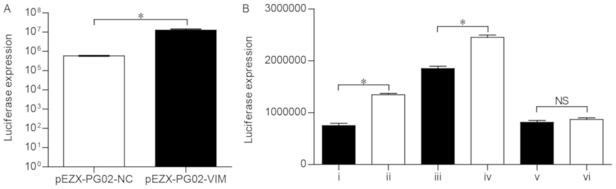 According to the results of prediction (Table III), two types of mutational pEZX-PG02-VIM promoter plasmids (pEZX-PG02-VIM-mut1 and pEZX-PG02-VIM-mut2) were constructed. To verify the activity of the pEZX-PG02-VIM promoter vector, the recombinant plasmid was transfected into Huh-7 cells and the luciferase expression was detected using a fluorescent microscope. Compared with the pEZX-PG02-NC group, the cells containing the pEZX-PG02-VIM recombinant plasmid exhibited significantly higher luciferase activity (P<0.05; Fig. 4A), indicating that the VIM promoter sequence can be bound and activated in Huh-7 cells.