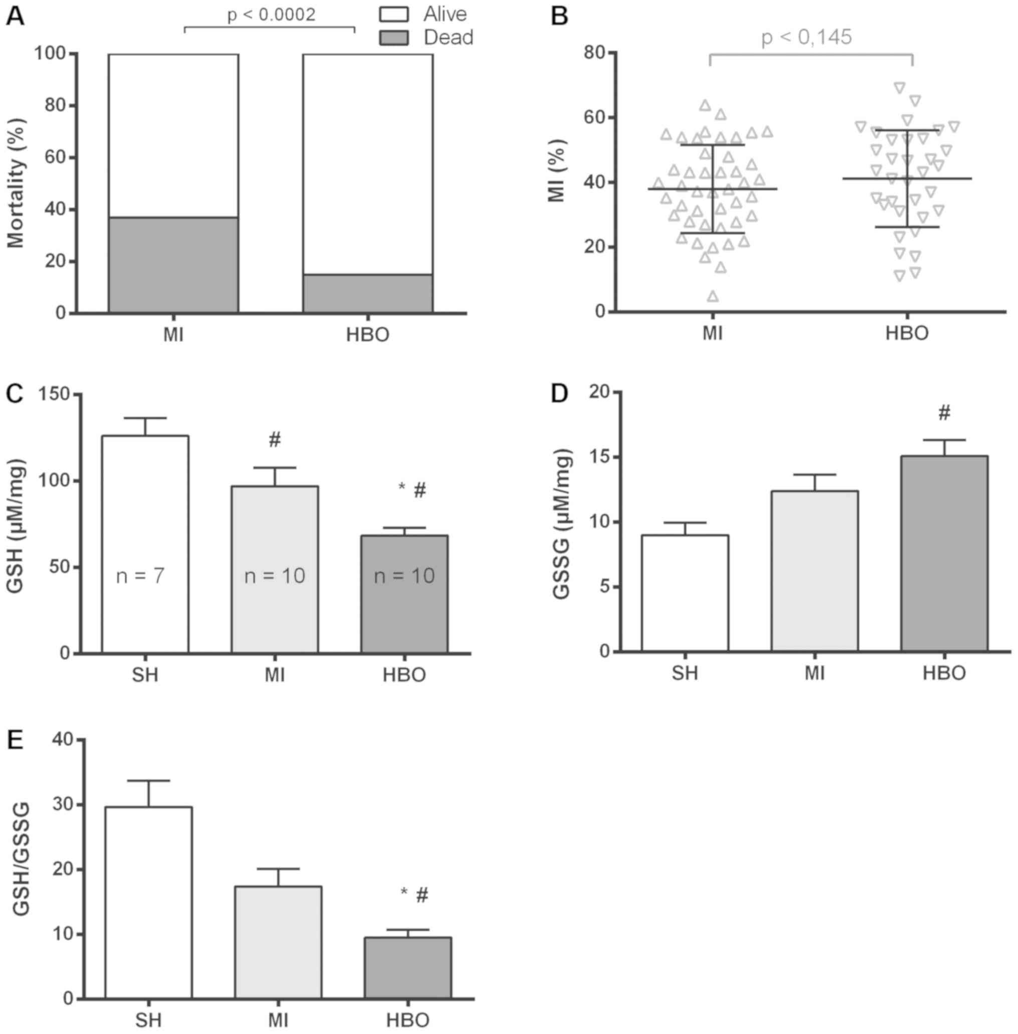 The lower level found in the GSH/GSSG ratio in the HBO group suggests an increase in glutathione (GSH) use, indicating a higher efficiency of the antioxidant mechanisms to protect against oxidative stress present in these animals. The same response was not observed in the untreated animals of the MI group. The higher glutathione disulfide (GSSG) formation indicates the increased levels of reactive oxygen species (ROS) formation induced by MI.