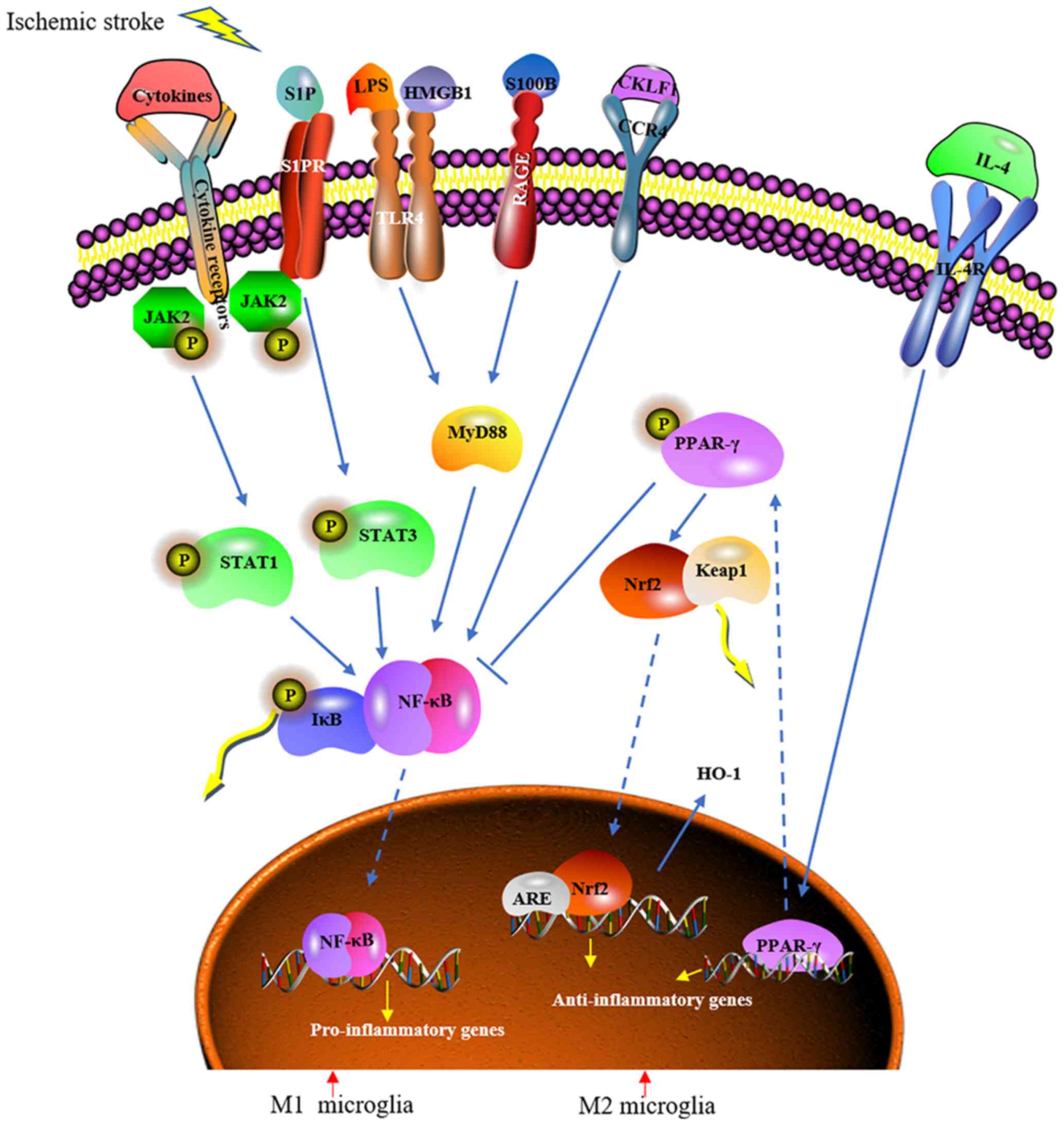 It has been suggested that ischemic stroke may be effectively treated through modulating microglia polarization; in general, these modulators include four categories: Transcription factors; receptors; ion channels; and gene modulators.