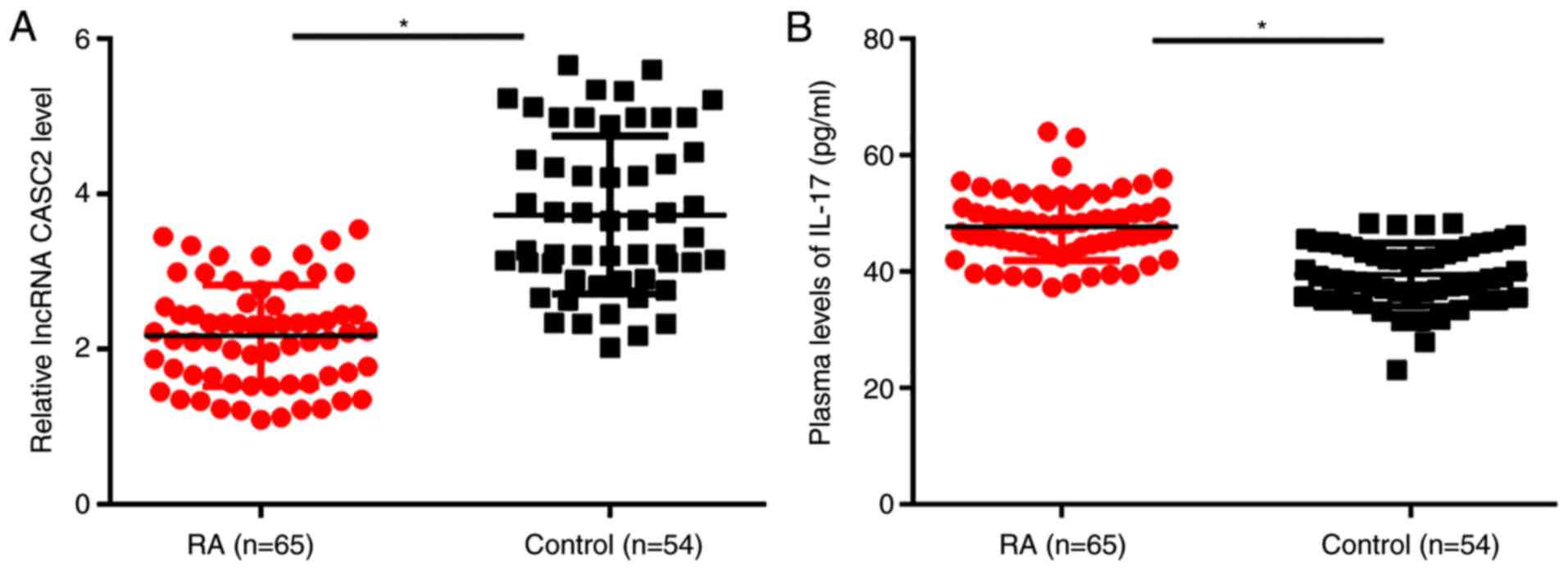 Results of qPCR showed that, compared with the healthy controls, plasma levels of lncRNA CASC2 were significantly decreased in patients with RA (P<0.05; Fig. 1A). In contrast, ELISA results showed that plasma IL-17 was upregulated in the plasma of RA patients when compared with that in the plasma of healthy controls (P<0.05; Fig. 1B).