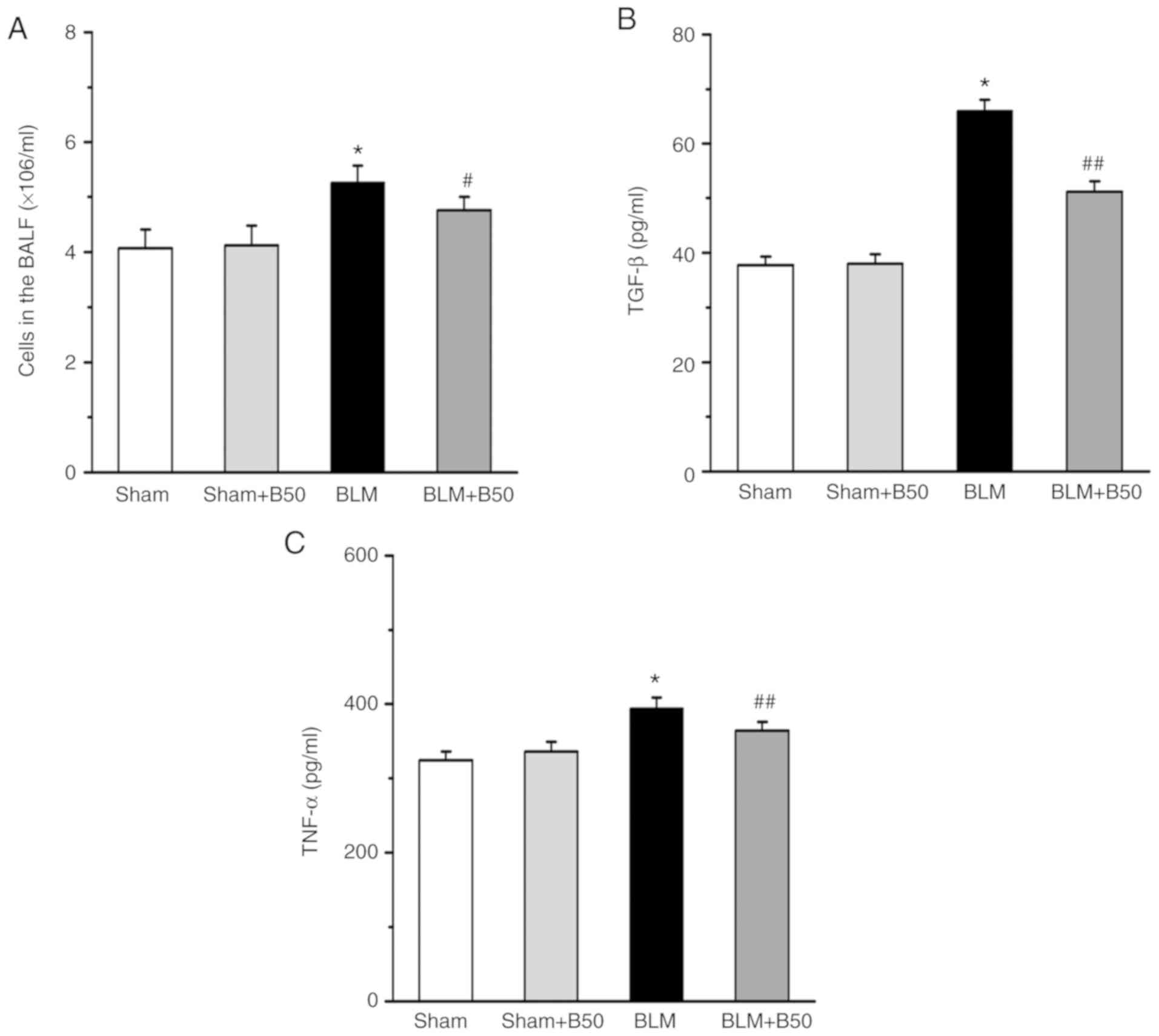 At day 28, the total number of cells in the BALF of rats treated with BLM (5 mg/kg) and baicalin (B50 mg/kg) was determined. The total number of cells in the BLM-treated group was significantly increased (5.26±0.31) compared with the sham group (4.07±0.34; Fig. 2A). However, the increase in the total cell number was decreased by the application of 50 mg/kg baicalin (4.76±0.24), while there was no significant difference between the sham group and the sham + baicalin 50 mg/kg group (4.12±0.36). The expression levels of TGF-β1 and TNF-α in the BALF were quantified by ELISA, which revealed that both TGF-β1 and TNF-α were significantly upregulated in the BALF of the BLM group (65.92±2.1 and 394±15, respectively) compared with the sham group (37.68±1.6 and 324±12, respectively). However, baicalin significantly decreased TGF-β1 and TNF-α expression (51.2±1.9 and 364±12, respectively) in BLM-treated rats. Moreover, baicalin did not affect the expression of TGF-β1 and TNF-α under sham conditions (38.01±1.7 and 336±13, respectively; Fig. 2B and C).