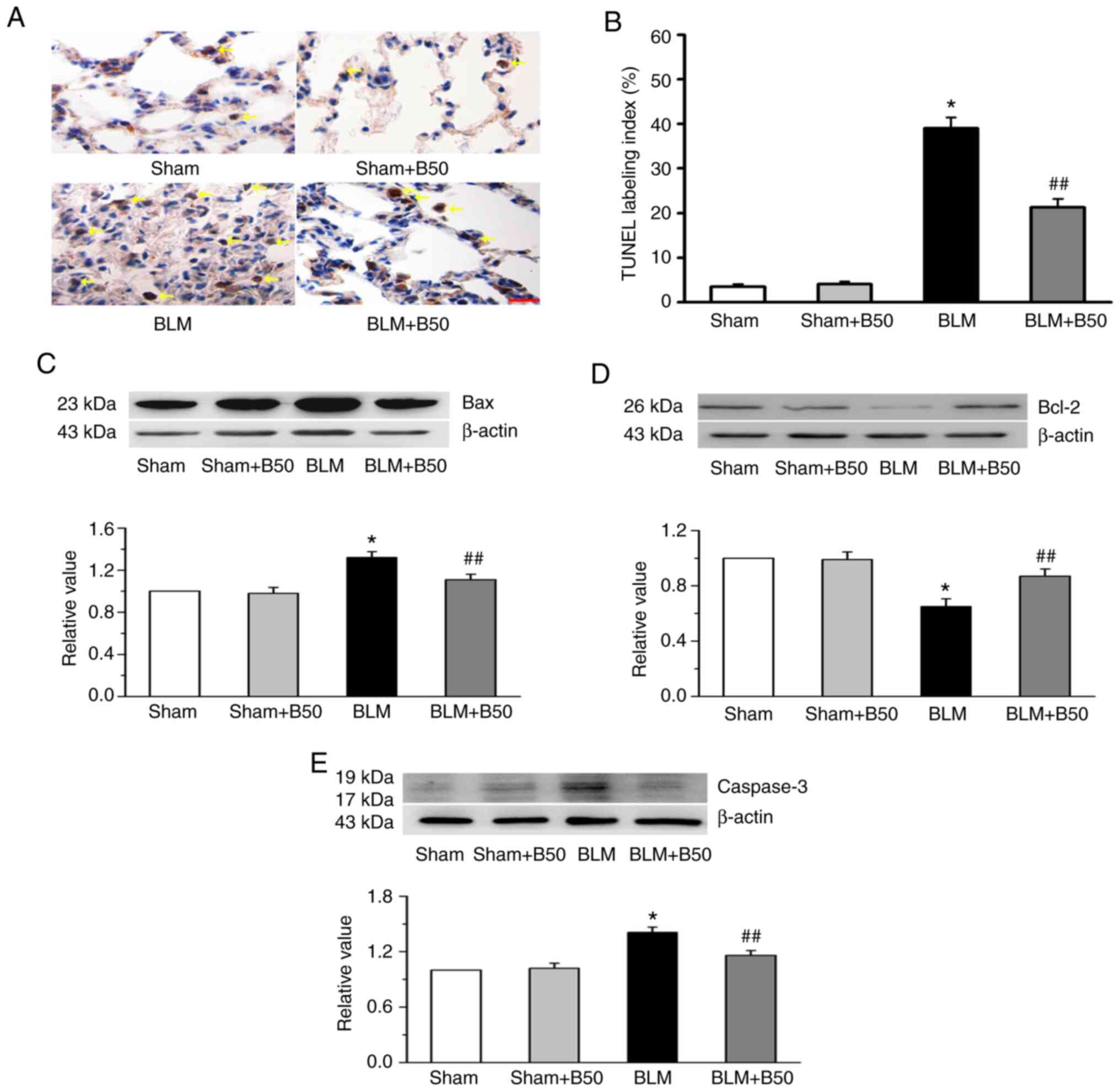 To investigate whether baicalin is involved in lung tissue apoptosis, TUNEL staining was conducted. Compared with the sham group, a significant increase in TUNEL-positive cells (yellow arrows) was observed in the BLM group (Fig. 4A and B). Furthermore, the administration of 50 mg/kg baicalin inhibited the appearance of TUNEL-positive cells in the BLM group, which was indicated in the yellow arrows, but not the sham group. In addition, the mechanism of baicalin-induced lung tissue apoptosis was investigated. Bcl-2 and Bax are localized on the mitochondrial membrane and play important roles in apoptosis (47). Bcl-2 is known to be anti-apoptotic, whereas Bax is a pro-apoptotic protein (47). Therefore, in the present study, the effect of baicalin on the protein expression levels of Bcl-2 and Bax were investigated. The data showed that the expression levels of Bcl-2 were downregulated, while that of Bax was upregulated by BLM. Moreover, baicalin (50 mg/kg) increased Bcl-2, and suppressed Bax protein expression in rat lung tissues (Fig. 4C and D). Pro-caspase-3 is cleaved and activated to form caspase-3 by originator caspases (including caspase 2, 8, 9, 10, 11 and 12) in response to apoptotic stimuli (48). In addition, BLM promoted the protein expression of caspase-3, an effect which was primarily blocked by 50 mg/kg baicalin treatment (Fig. 4E). However, baicalin had no significant effect on the expression of Bcl-2, Bax and caspase-3 in the sham group.