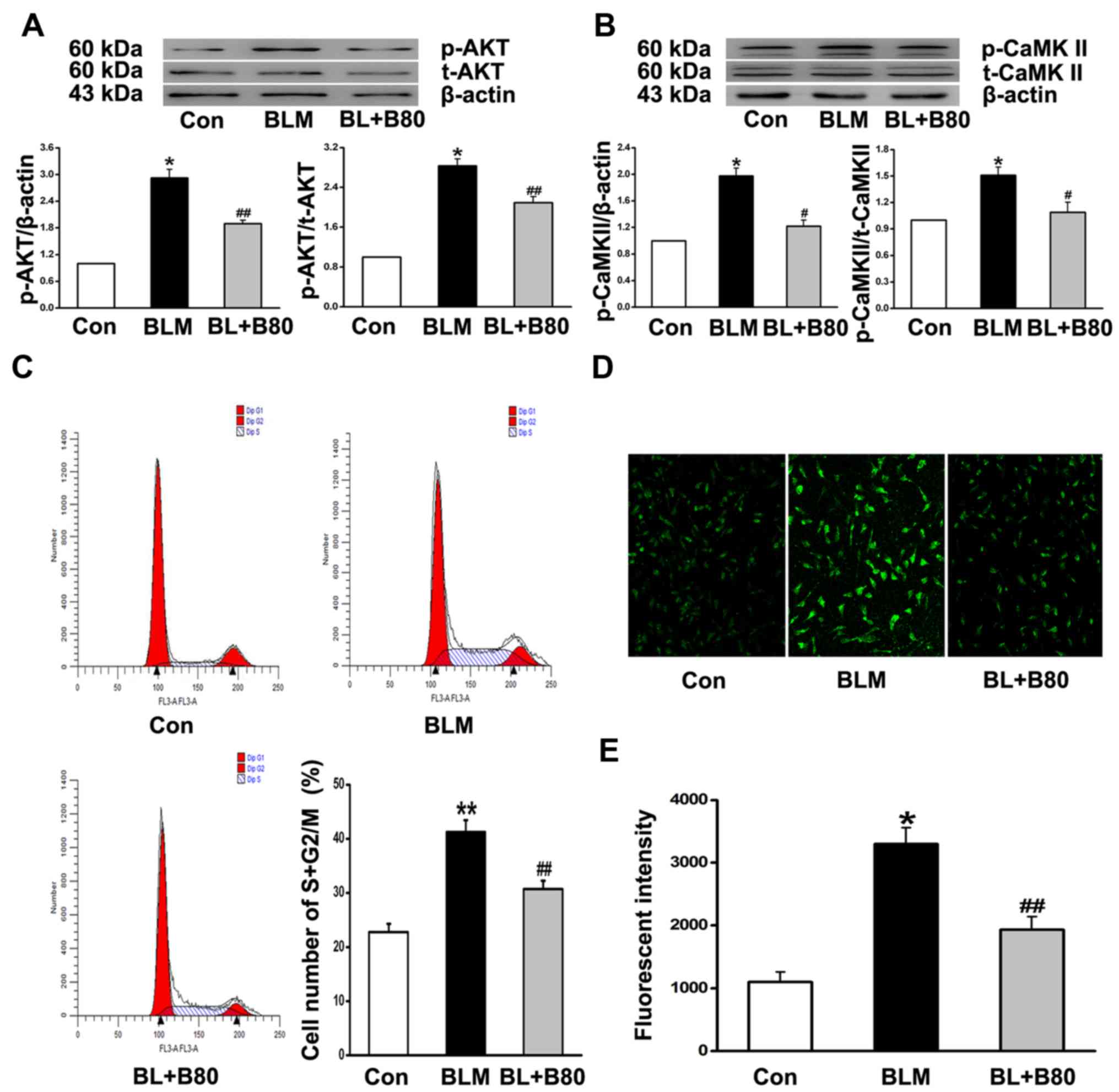 Following BLM treatment, MTT was used to examine the effect of baicalin on the viability of rat lung fibroblasts. After a 24-h treatment period (1.0, 10, 20 or 40 µg/ml BLM) caused a significant dose-dependent increase in lung fibroblast viability, compared with that of the control group (Fig. 5A). With regards to the safety of the drug, 20 µg/ml BLM was selected for the following experiments. To demonstrate the effect of baicalin on lung fibroblasts, the dose-dependent effect was examined. Treatment with 40, 60 or 80 µg/ml baicalin reduced cell viability at 24 h, while 20 µg/ml baicalin failed to reduce cell viability under 20 µg/ml BLM treatment. Among the different treatment doses, 80 µg/ml baicalin exerted the most significant inhibitory effect (Fig. 5B). Therefore, unless otherwise stated, all subsequent experiments were performed under these conditions (24 h, 20 µg/ml BLM and 80 µg/ml baicalin). Western blot analysis was conducted to observe the expression levels of cyclin proteins in lung fibroblasts treated with 80 µg/ml baicalin. The results indicated that 20 µg/ml BLM significantly increased the expression of cyclin A, cyclin D, cyclin E, as well as PCNA in rat fibroblasts (Fig. 5C-F). CaMKII is reported to be activated by intracellular Ca2+ (35), and the western blot results indicated a significant increase in p-AKT and p-CaMKII expression levels in the BLM group (Fig. 6A and B). However, 80 µg/ml baicalin suppressed the expression of cyclin A, D and E, PCNA, p-AKT and p-CaMKII (Figs. 5C-F and 6A and B).