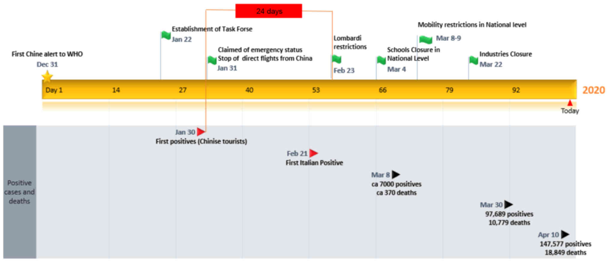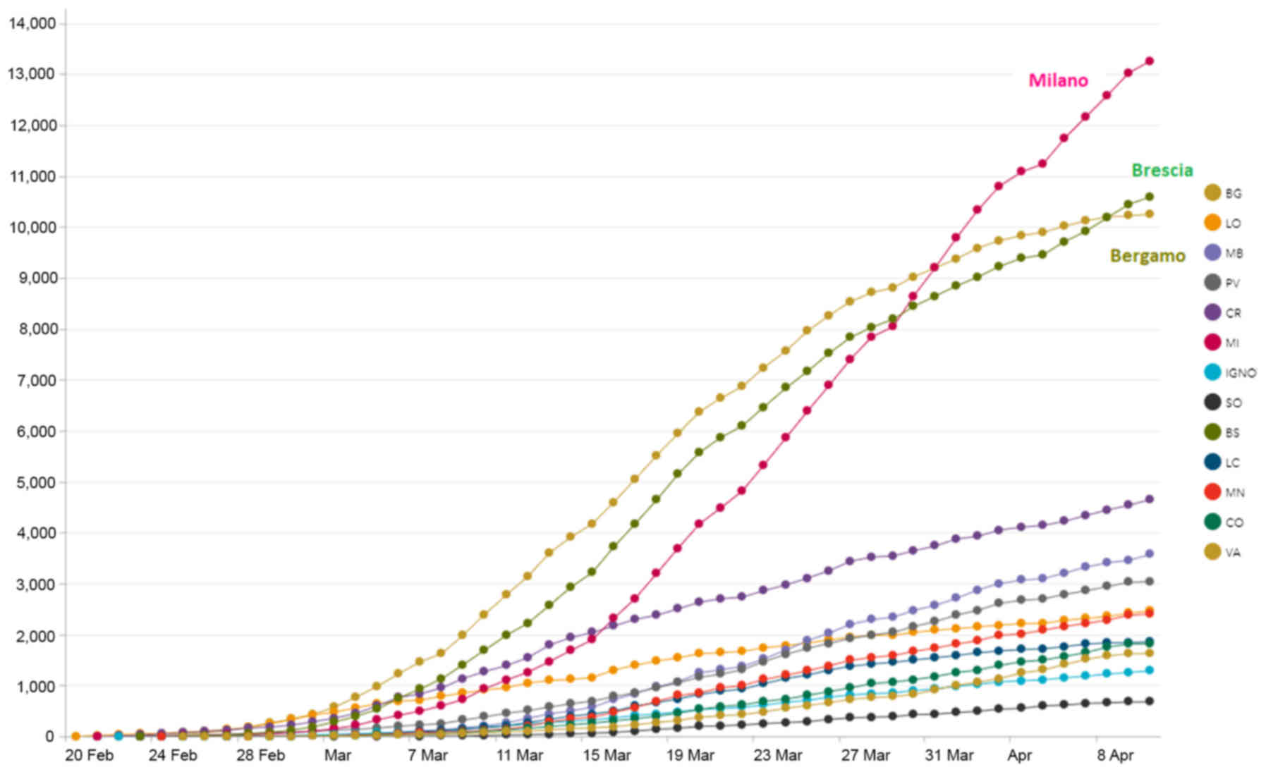 Though, information from China was already available and many scientists globally warned about the risk of a great outbreak, this knowledge was not used efficiently, resulting in the fast spread of COVID-19 in the population. The fact that Milan and Bergamo areas have three international airports and a great number of visitors from all over the world, for business and tourism, the effect of this international influx of people was probably underestimated.