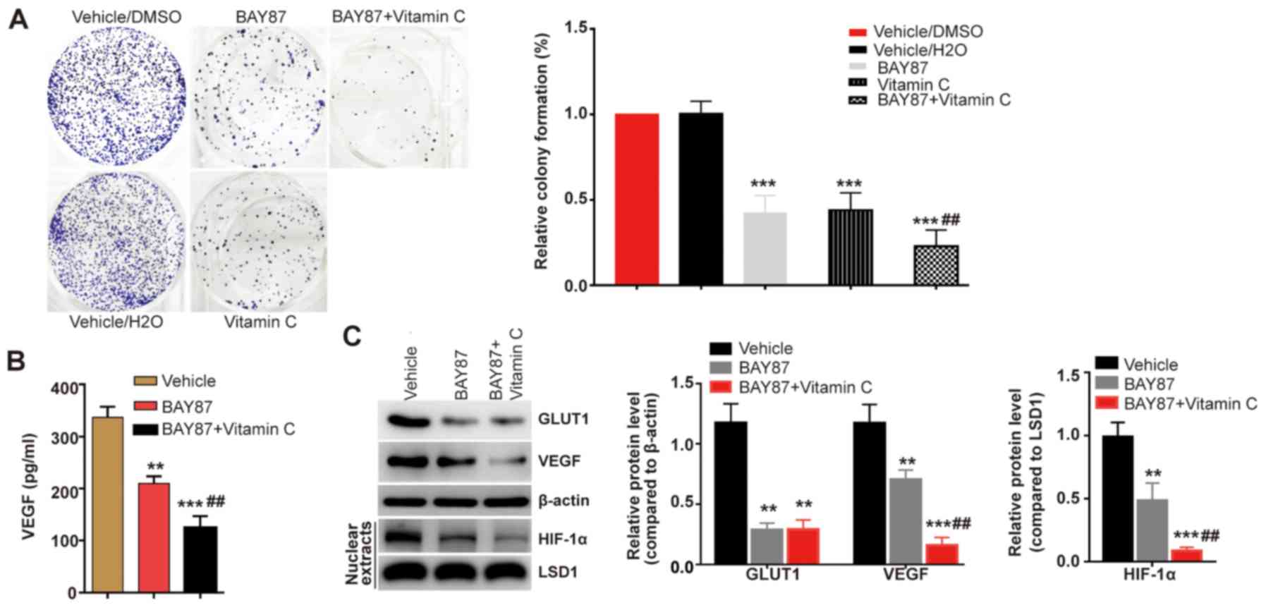 An ELISA was used to detect the secretory levels of VEGF in HLE-B3 cells. Briefly, a total of 1×106 HLE-B3 cells were treated with DMSO vehicle, 100 nM BAY 87-2243100 or 100 nM BAY 87-2243100 and 100 µM vitamin C at 37°C for 12 h. Following centrifugation of 2,000 × g for 20 min at room temperature, cell culture supernatants were collected. VEGF levels were measured using a Human VEGF Quantikine ELISA kit (cat. no. DVE00; R&D Systems, Inc.) according to the manufacturer's protocol.