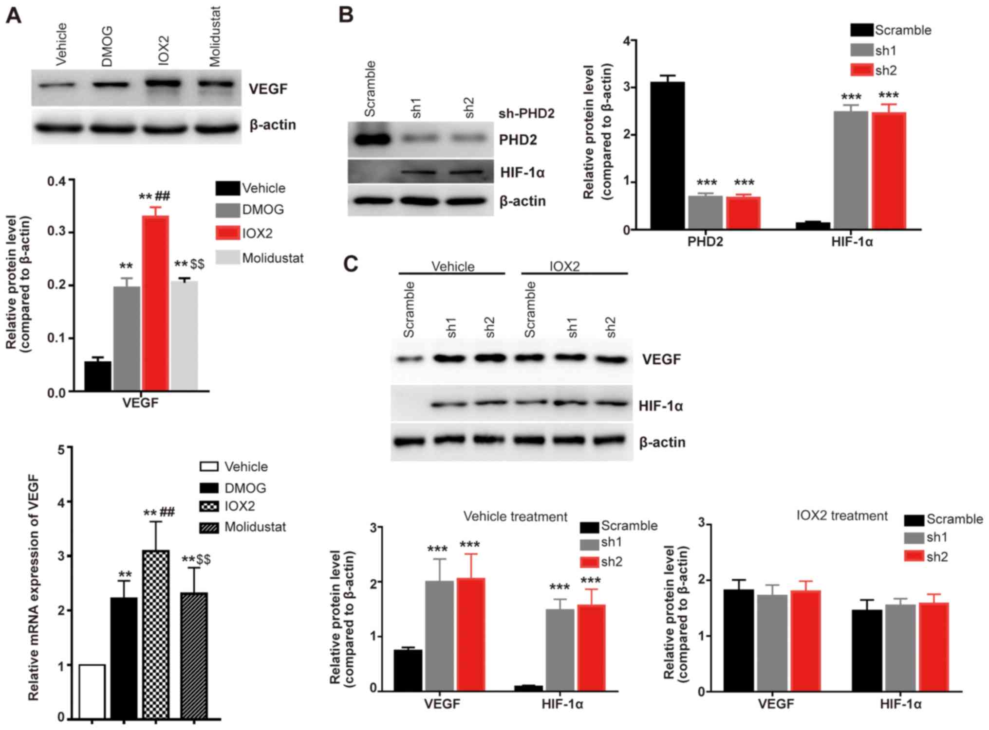 To further investigate the mechanism via which vitamin C regulates VEGF expression levels, the present study used three PHDs inhibitors (DMOG, IOX2 and Molidustat) to investigate their effects on the expression levels of VEGF. All of these inhibitors were found to significantly increase the expression levels of VEGF compared with the vehicle treated cells (Fig. 3A); the PHD2 specific inhibitor IOX2 exhibited the most significant effect at both the mRNA and protein expression level compared with the non-selective inhibitors DMOG and Molidustat (Fig. 3A). A PHD2 stable genetic knockdown model was subsequently established in HLE-B3 cells (Fig. 3B) and increased expression levels of HIF-1α were observed in the stable PHD2 knockdown HLE-B3 cells (both sh1 and sh2) compared with the scramble control-transfected cells (Fig. 3B). Furthermore, the genetic knockdown of PHD2 significantly increased the expression levels of VEGF compared with the scramble group (Fig. 3C); however, there were no significant differences in the expression levels of VEGF and HIF-1α in PHD2 knockdown HLE-B3 cells treated with the PHD2 specific inhibitor IOX2 compared with the scramble IOX2-treated cells (Fig. 3C). PHD2 is responsible for the proline hydroxylation of AKT and hence inhibits the activation of AKT (25). These findings were consistent with the hypothesis that vitamin C inhibits AKT kinase activity by enhancing the prolyl hydroxylation of AKT.