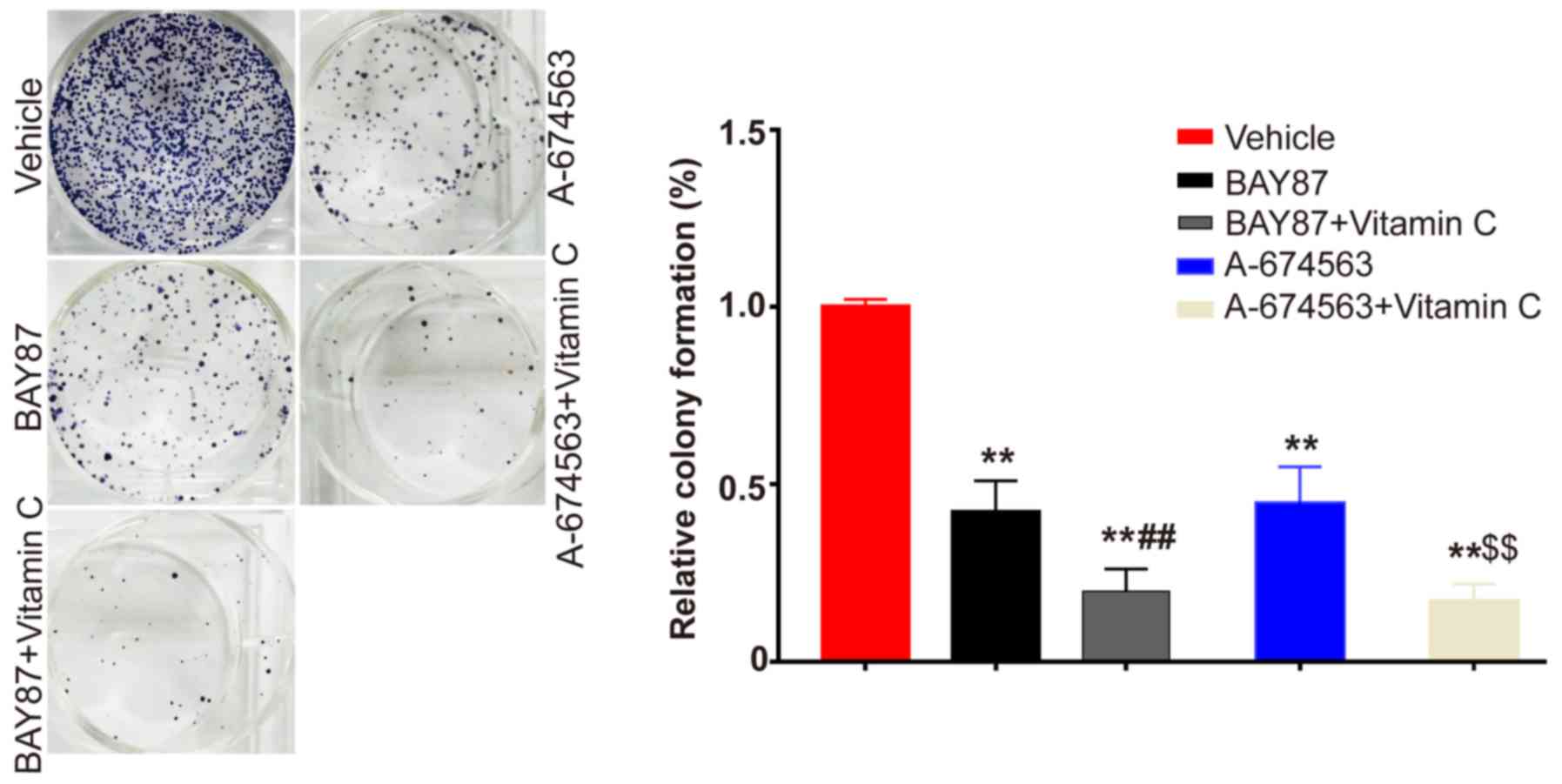 A total of 2.5×102 HLE-B3 cells/well were plated into 6-cm well plates and incubated for 24 h. Cells were subsequently treated with the DMSO vehicle control [equal volume to the inhibitor; Sigma-Aldrich (Merck KGaA)] or different inhibitors (100 nM BAY 87-2243100; 100 µM vitamin C; 5 µM A-674563) at 37°C for 12 days. Following the incubation, cells were fixed with 75% ethanol at 37°C for 15 min and then stained with 0.01% crystal violet at 37°C for 30 min and visualized. The relative colony formation rate (%) was determined using the following equation: (Number of colonies formed from drug-treated cells/number of colonies formed from untreated cells) ×100.