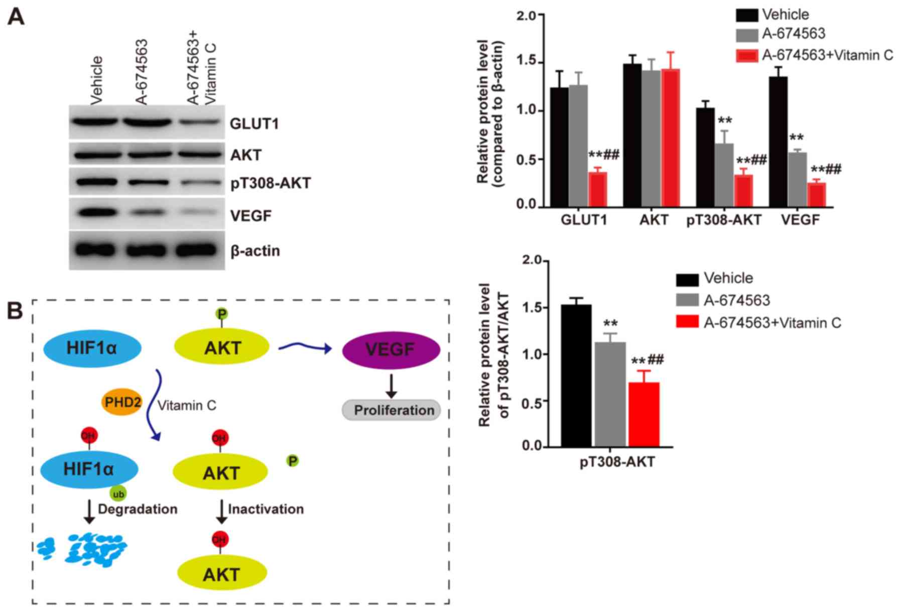 In conclusion, the findings of the present study demonstrated that the AKT inhibitor A-674653 inhibited the activity of AKT and the expression levels of VEGF but did not affect the expression levels of the HIF-1α target protein GLUT1. Notably, the cotreatment of cells with vitamin C and the AKT inhibitor A-674563 reduced the phosphorylation status of AKT and the expression levels of VEGF compared with the A-674563 treatment alone. In addition, vitamin C exhibited synergistic effects with the HIF-1 inhibitor or AKT inhibitor to suppress the proliferation of human LECs. Therefore, the present study provided evidence to suggest that vitamin C may inhibit the expression levels of VEGF via HIF-1α dependent and AKT dependent pathways in LECs. Thus, it is possible that vitamin C treatment may facilitate PCO prevention in clinical practice by inhibiting the proliferation of LECs.