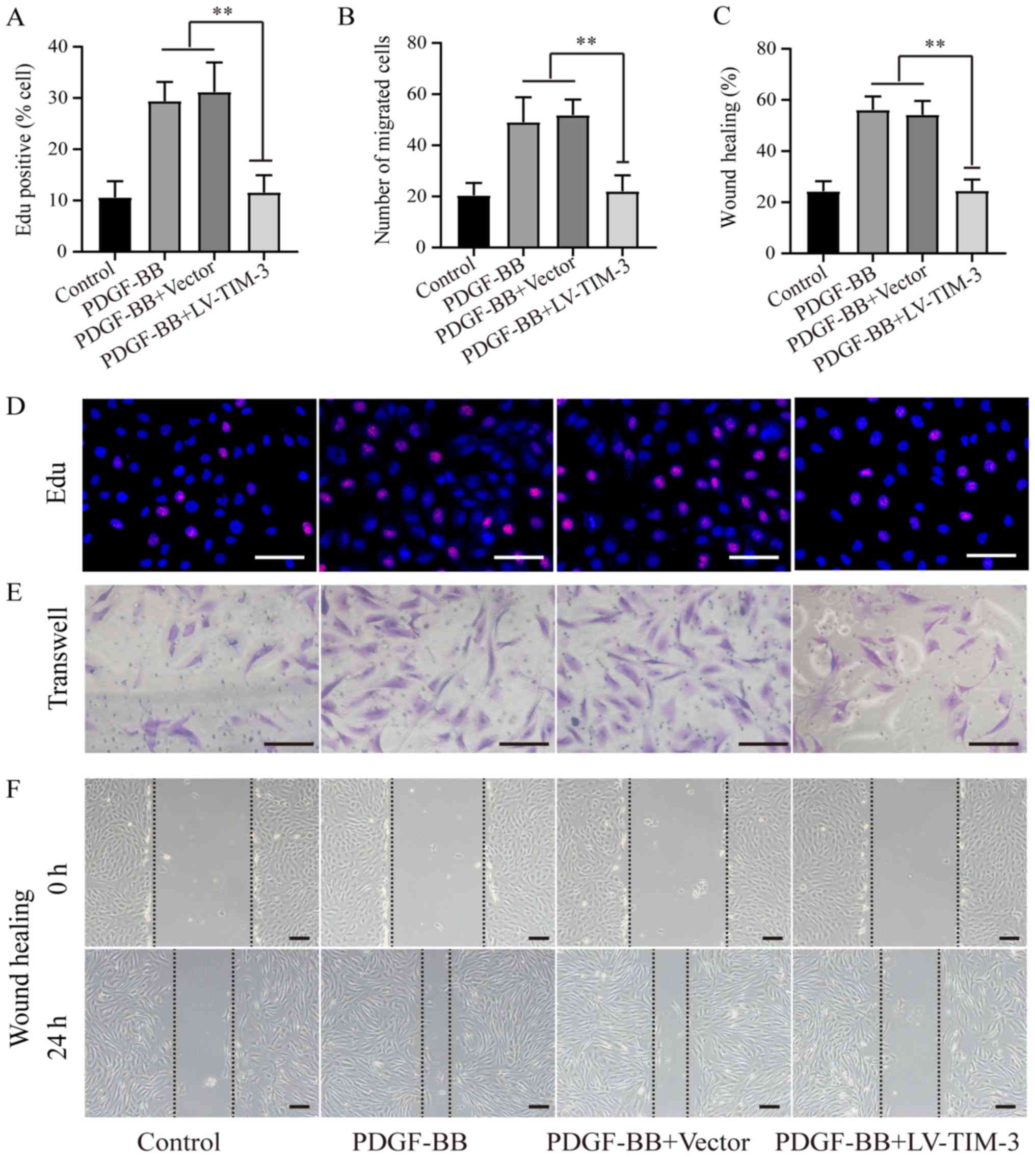 To further investigate the functional role of TIM-3, a lentiviral vector (LV-TIM-3) was used to overexpress TIM-3 in HASMCs (Fig. S1). To determine the effect of TIM-3 on the proliferation and migration of HASMCs, EdU (Fig. 3A and D), Transwell (Fig. 3B and E) and wound healing (Fig. 3C and F) assays were performed. The proportion of EdU-positive cells was significantly lower in the PDGF-BB + LV-TIM-3 group (11.58±3.36%) compared to the PDGF-BB (29.42±3.72%) and the PDGF-BB + Vector (31.18±7.78%) groups, but was not significantly different compared to the control group (10.06±3.18%; Fig. 3A). The mean number of migratory cells was significantly reduced in the PDGF-BB + LV-TIM-3 group (22.0±6.2) compared to the PDGF-BB (49.0±9.8) and PDGF-BB + Vector (51.8±6.1) groups, but was also not significantly different compared to the control group (22.4±4.9; Fig. 3B). The wound healing assay results were similar to the Transwell assay results (Fig. 3C). The results demonstrated that LV-TIM-3-mediated TIM-3 overexpression in HASMCs inhibited proliferation and migration in PDGF-BB-stimulated HASMCs.