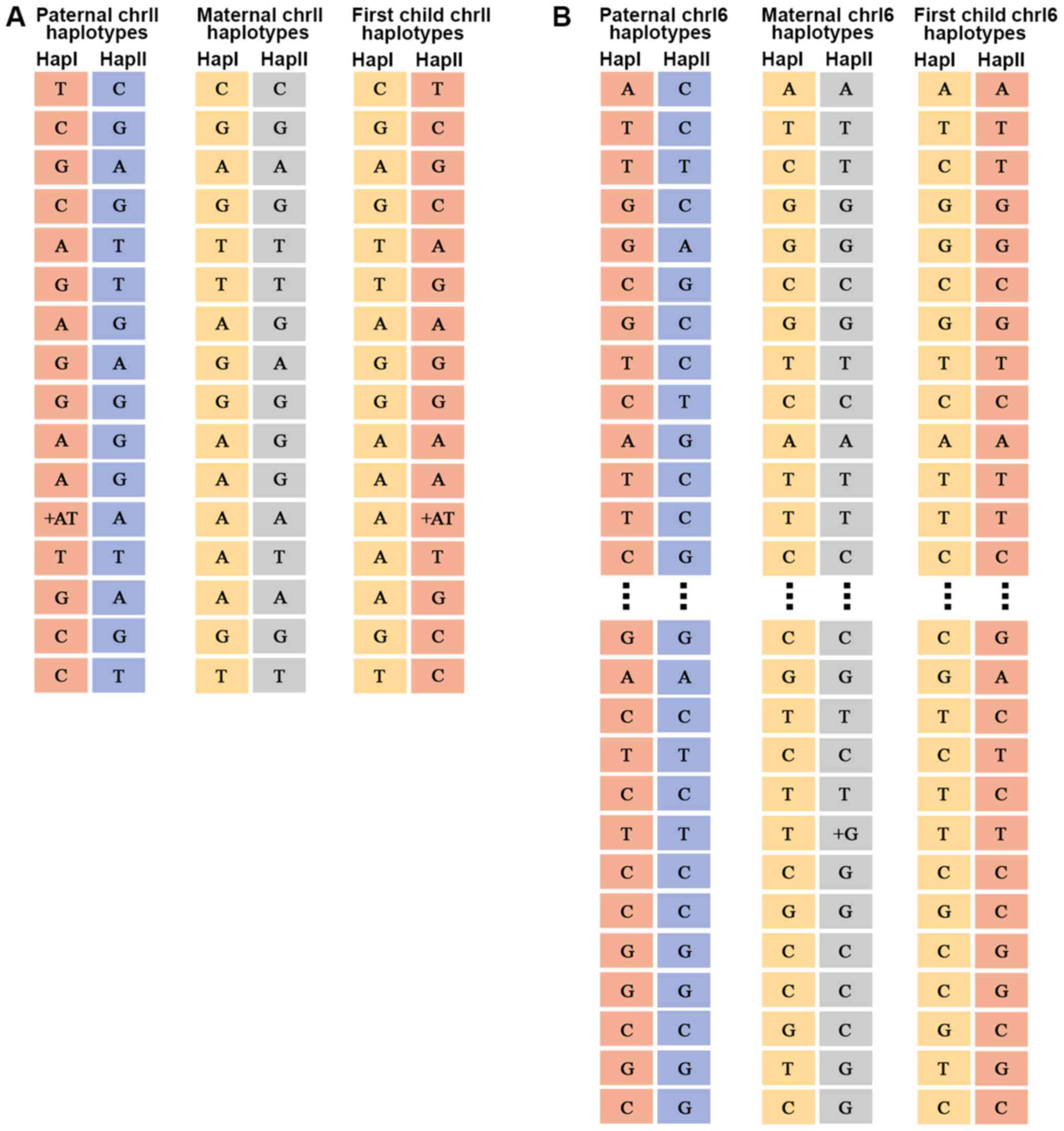 The fractional fetal DNA concentration in the maternal plasma, f, can be calculated from sequencing data as f=2p/(p + q), where p is the number of sequenced reads of the fetal specific allele and q is the read count of the other allele, which is shared by the maternal and fetal genomes (31). The average percentage of fetal DNA in maternal plasma was found to be 17.3% (range, 15–19%) (data not shown). For the father, mother and child, the chromosome 11 and 16 haplotypes were sorted into 16 and 87 different SNP categories, respectively (data not shown). An example of chromosome 11 and 16 haplotypes for a family is illustrated in Fig. 2. The genotype information of the parents was used to determine the parental haplotype and its linkage to the pathogenic allele according to Mendelian inheritance laws (32). Detailed information regarding the haplotypes associated with the pathogenic allele is provided in Table II.