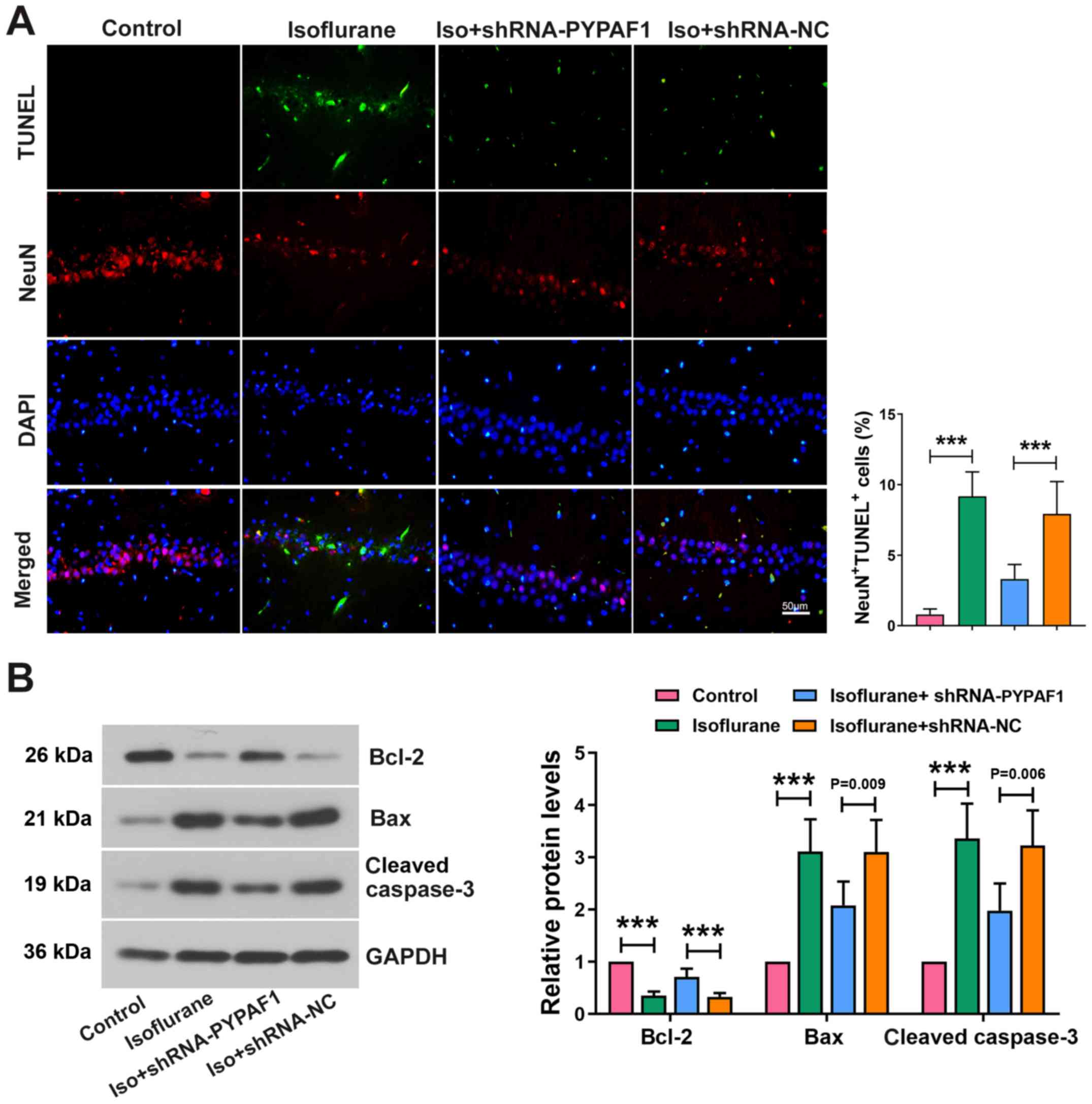 TUNEL assay was performed to assess neuronal apoptosis in the hippocampus. Apoptotic neurons were markedly increased following isoflurane exposure, which was partially reversed following PYPAF1 knockdown. Isoflurane treatment decreased the expression of NeuN, whereas silencing PYPAF1 alleviated the effects of isoflurane (Fig. 5A). Furthermore, the protein expression levels of Bax and cleaved caspase-3 were increased by isoflurane, and the elevation was partially abolished by silencing of PYPAF1. The protein levels of Bcl-2 revealed the opposite results (Fig. 5B).