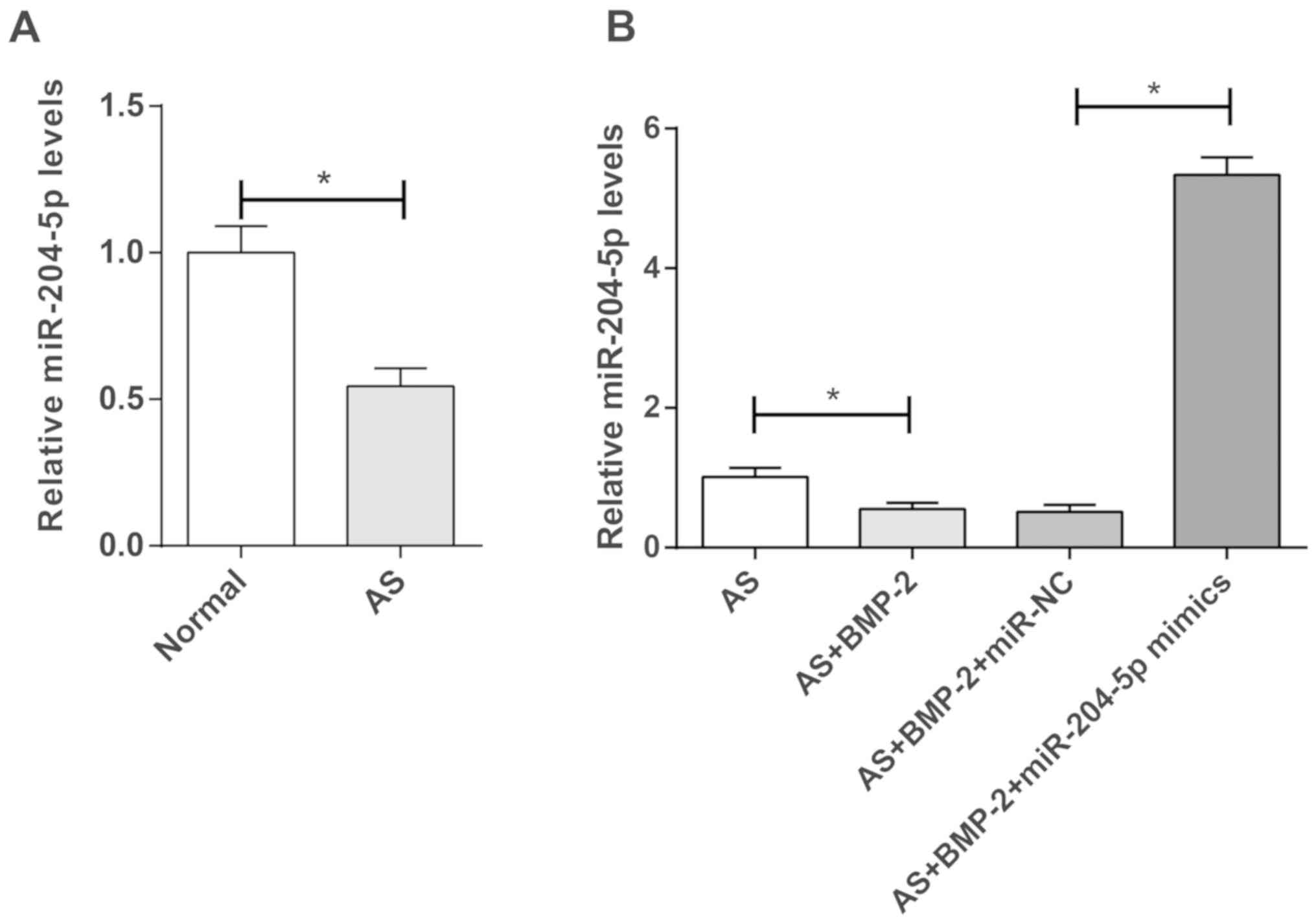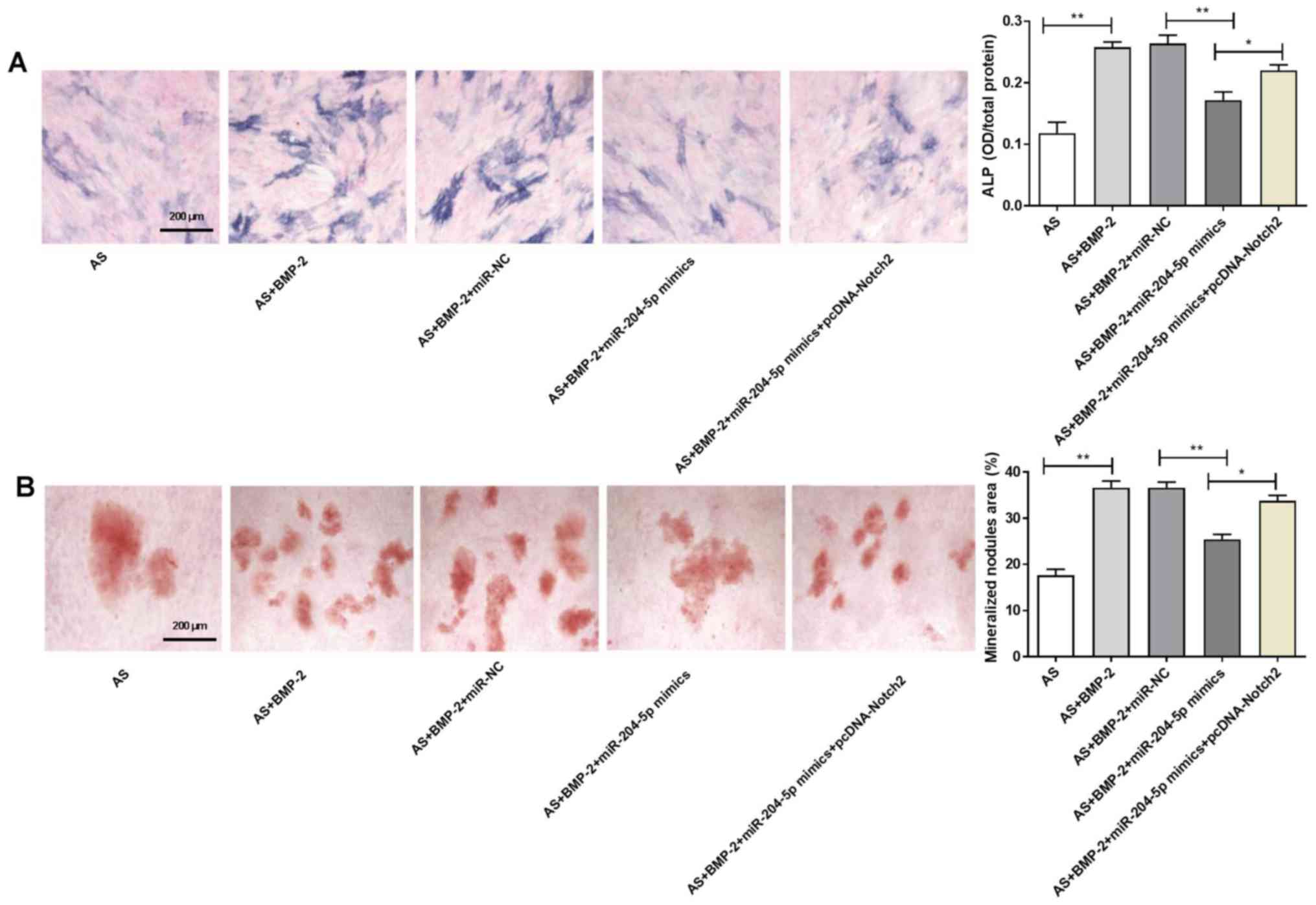 In the current study mRNA expression was detected using reverse transcription-quantitative PCR (RT-qPCR). The binding site between Notch2 and miR-204-5p was predicted using TargetScan software and assessed via the dual-luciferase reporter assay. Moreover, ALP activity was assessed via the ALP assay, while the mineralized nodules area was determined via the Alizarin Red S staining assay. In addition, BMP-2 was used to induce osteogenic differentiation of AS fibroblasts, and the regulatory role of miR-204-5p on the osteogenic differentiation of AS fibroblasts, and the underlying molecular mechanism involving the Notch signaling pathway were assessed. Taken together, the results of the present study provide a theoretical basis for the treatment of patients with AS.