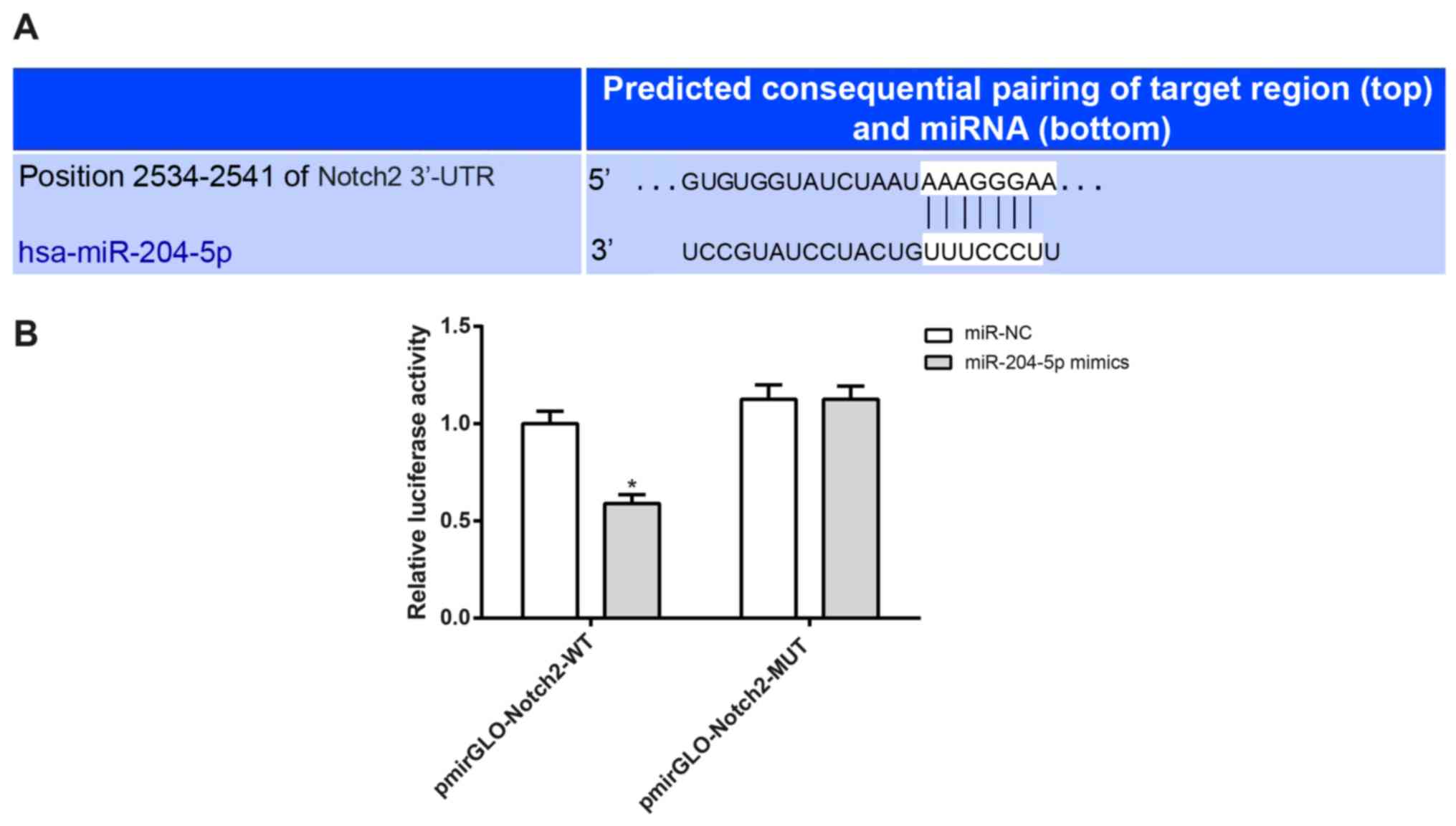 TargetScan software v3.0 (http://starbase.sysu.edu.cn.) was used to predict the targeting relationship between miR-204-5 and Notch2. A 3′-untranslated region (UTR) wild type (WT) plasmid of Notch2 (Notch2-3′-UTR-WT) was constructed according to the 3′-UTR sequence of Notch 2. Based on this plasmid, a binding site was mutated to construct a 3′-UTR mutant (MUT) plasmid (Notch2-3′-UTR-MUT). The construction and sequencing of the plasmids were performed by Sangon Biotech Co., Ltd. Subsequently, the constructed luciferase reporter plasmids, pmirGLO-Notch2-WT/pmirGLO-Notch2-MUT (Shanghai GenePharma Co., Ltd.) and miR-204-5p mimics/miR-NC were co-transfected into 293T cells (American Type Culture Collection) using Lipofectamine® 2000 transfection reagent (Thermo Fisher Scientific, Inc.). The luciferase activity was measured using the dual luciferase activity assay kit (Thermo Fisher Scientific, Inc.), 48 h post-transfection, and was normalized to Renilla luciferase activity.