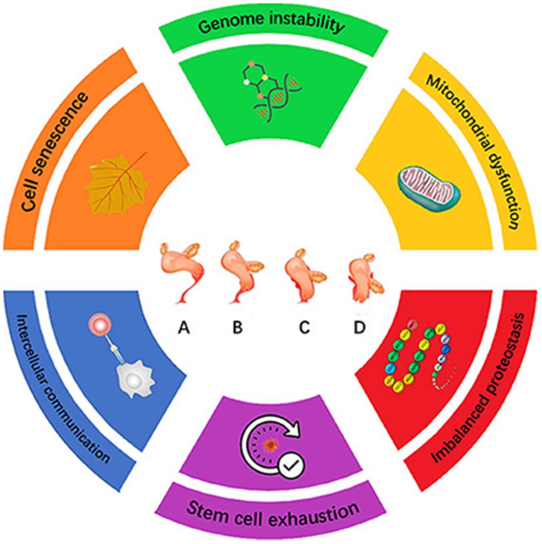 On a cellular basis, general cell senescence is the predominant process driving aging. There are a number of phenotypes associated with cellular aging, including genomic instability, telomere attrition, epigenetic alterations, loss of proteostasis, dysregulated nutrient sensing, mitochondrial dysfunction, cellular senescence, stem cell exhaustion and altered intercellular communication (Fig. 1) (8). In the present review, the roles of cellular senescence in POP, in addition to the possible senescence biomarkers reported from previous POP studies, will be discussed. It is hoped that this information can provide novel insights into the pathogenesis of POP.