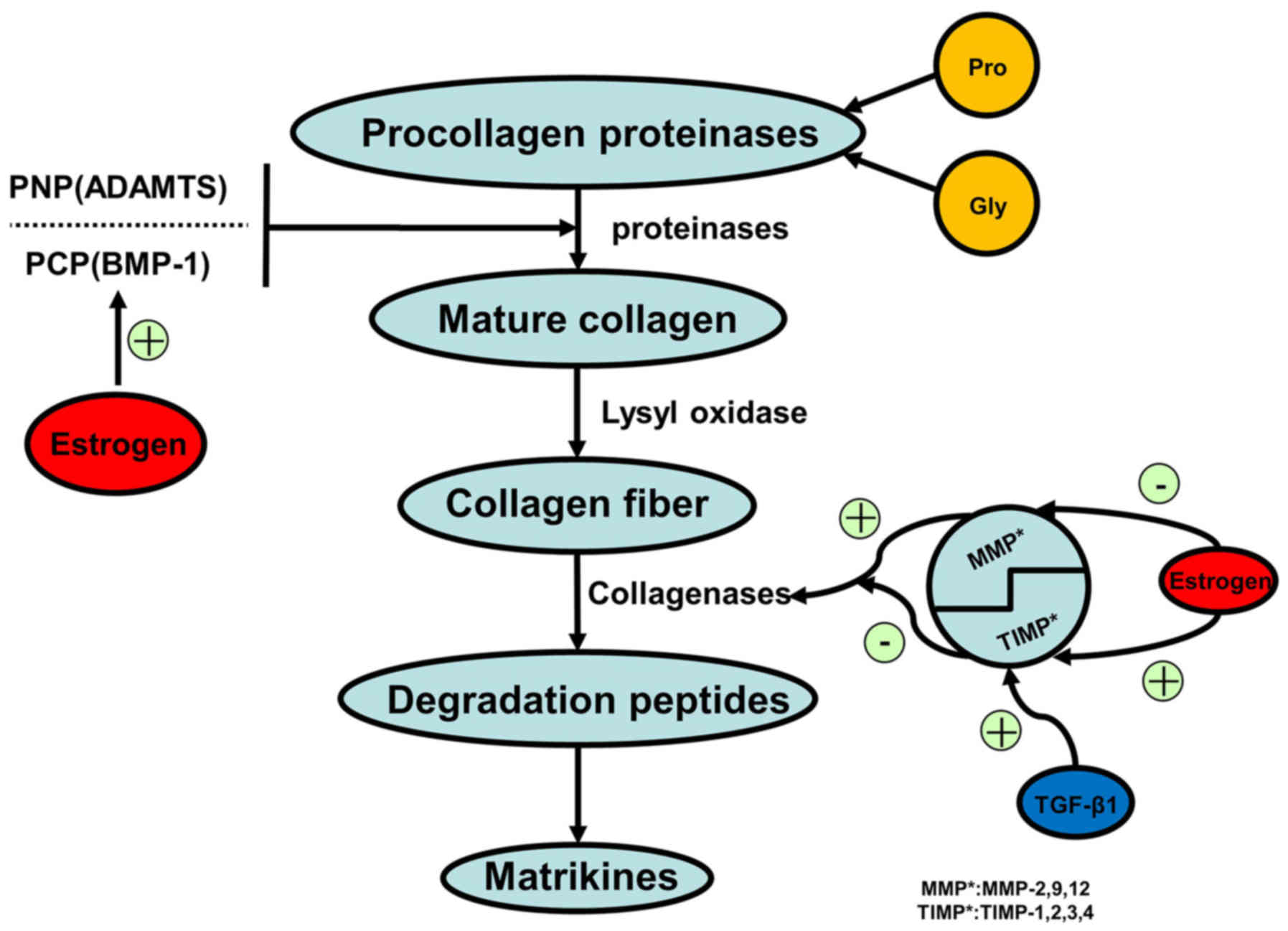 Imbalanced proteostasis in elderly patients with POP presents as marked reductions in estrogen, leading to lower levels of mature enzymes, including the lysyl oxidase family of enzymes, a disintegrin and metalloproteinase with thrombospondin motifs and bone morphogenetic protein-1 (BMP1) (45,46). Estrogen treatment on post-menopausal patients with POP resulted in the enhanced expression of collagens and elastin through regulation of the BMP1 and MMP/TIMP complexes to improve the wound healing process, in turn leading to the preservation of fibroblasts and supportive collagens (47). MMP-1, MMP-2 and MMP-3 showed a reduction in expression along with an increase in TIMP1/4 expression after estrogen treatment in elderly patients with POP (47). Observations from local estrogen therapy indicates the essential role of proteostasis during senescence within the pelvic tissue environment, including the balance between BMP1, MMP/TIMP and procollagen/collagen. In this regard, estrogen serves to balance the protein levels, limit undesirable ECM degradation and to strengthen the vaginal ECM supporting structures.