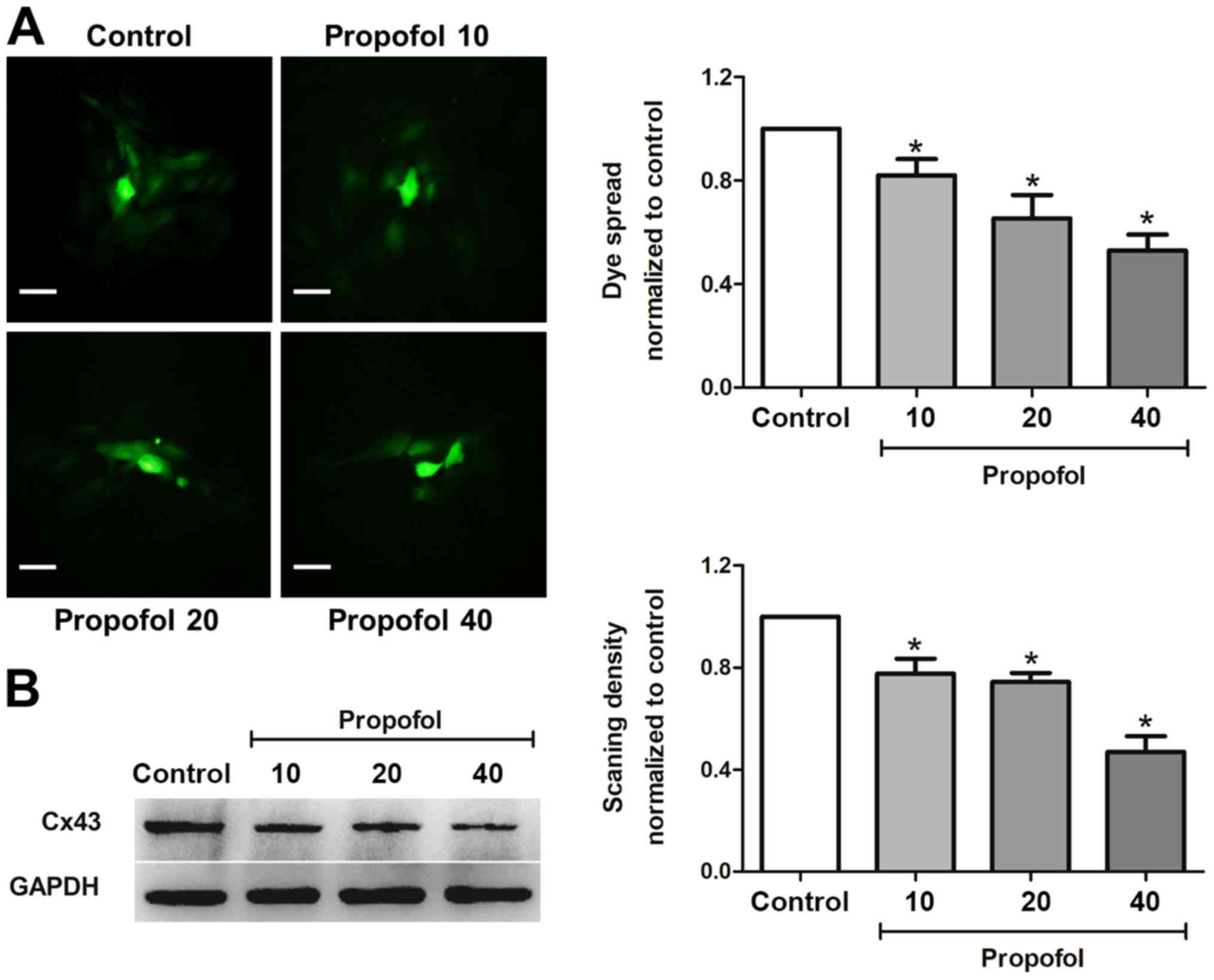 Gap junction function is mediated by the protein levels of a variety of Cx proteins. Cx43 is one of the most abundant Cx proteins in astrocytes (7). Furthermore, Cx43 has a neuroprotective effect in cerebral ischemic injury (8). Therefore, it was investigated whether propofol inhibited gap junction function via Cx43. Astrocytes were treated with different concentrations of propofol (10, 20 and 40 µM) for 1 h and the protein levels of Cx43 were measured. Propofol significantly decreased the protein levels of Cx43 in a dose-dependent manner (Fig. 3B). These data suggested that propofol inhibited gap junction function by downregulating the expression levels of Cx43 in astrocytes.